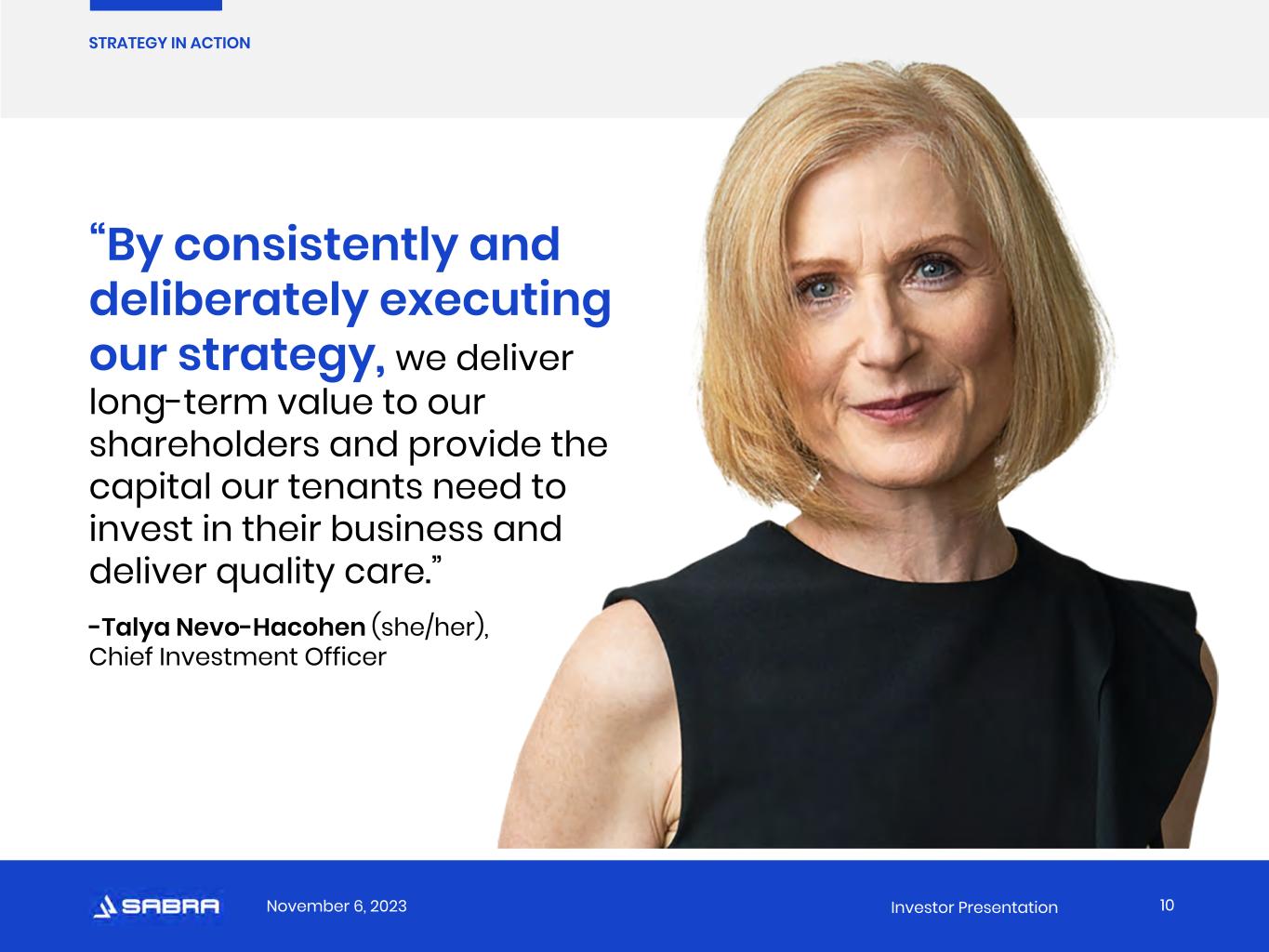 November 6, 2023 Investor Presentation Recent Highlights 9 STRATEGY IN ACTION Inspirit Transition ▪ As previously disclosed, Sabra successfully transitioned the 11 wholly-owned senior housing managed properties formerly operated by Enlivant to Inspirit Senior Living on July 6, 2023. Performance has so far exceeded expectations, highlighted by occupancy in September 2023 increasing more than 230 bps compared to June 2023. Capital Recycling ▪ During the third quarter of 2023, Sabra generated $80 million of gross proceeds from the disposition of 13 skilled nursing and two senior housing facilities. Net proceeds were used to reduce the outstanding balance on the Company’s revolving credit facility.