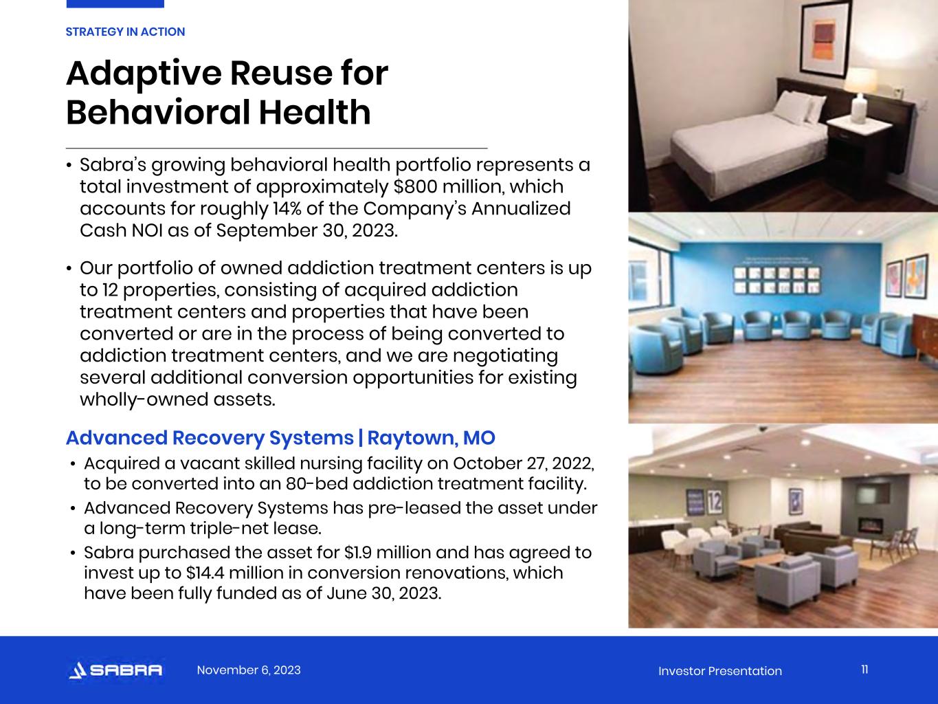 November 6, 2023 Investor Presentation Adaptive Reuse for Behavioral Health 11 STRATEGY IN ACTION • Sabra’s growing behavioral health portfolio represents a total investment of approximately $800 million, which accounts for roughly 14% of the Company’s Annualized Cash NOI as of September 30, 2023. • Our portfolio of owned addiction treatment centers is up to 12 properties, consisting of acquired addiction treatment centers and properties that have been converted or are in the process of being converted to addiction treatment centers, and we are negotiating several additional conversion opportunities for existing wholly-owned assets. Advanced Recovery Systems | Raytown, MO • Acquired a vacant skilled nursing facility on October 27, 2022, to be converted into an 80-bed addiction treatment facility. • Advanced Recovery Systems has pre-leased the asset under a long-term triple-net lease. • Sabra purchased the asset for $1.9 million and has agreed to invest up to $14.4 million in conversion renovations, which have been fully funded as of June 30, 2023.