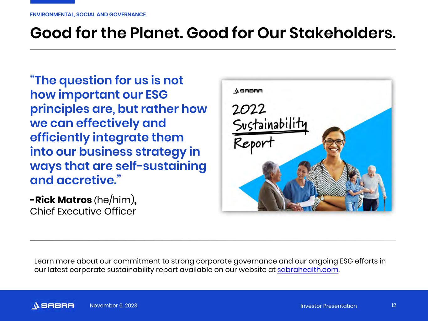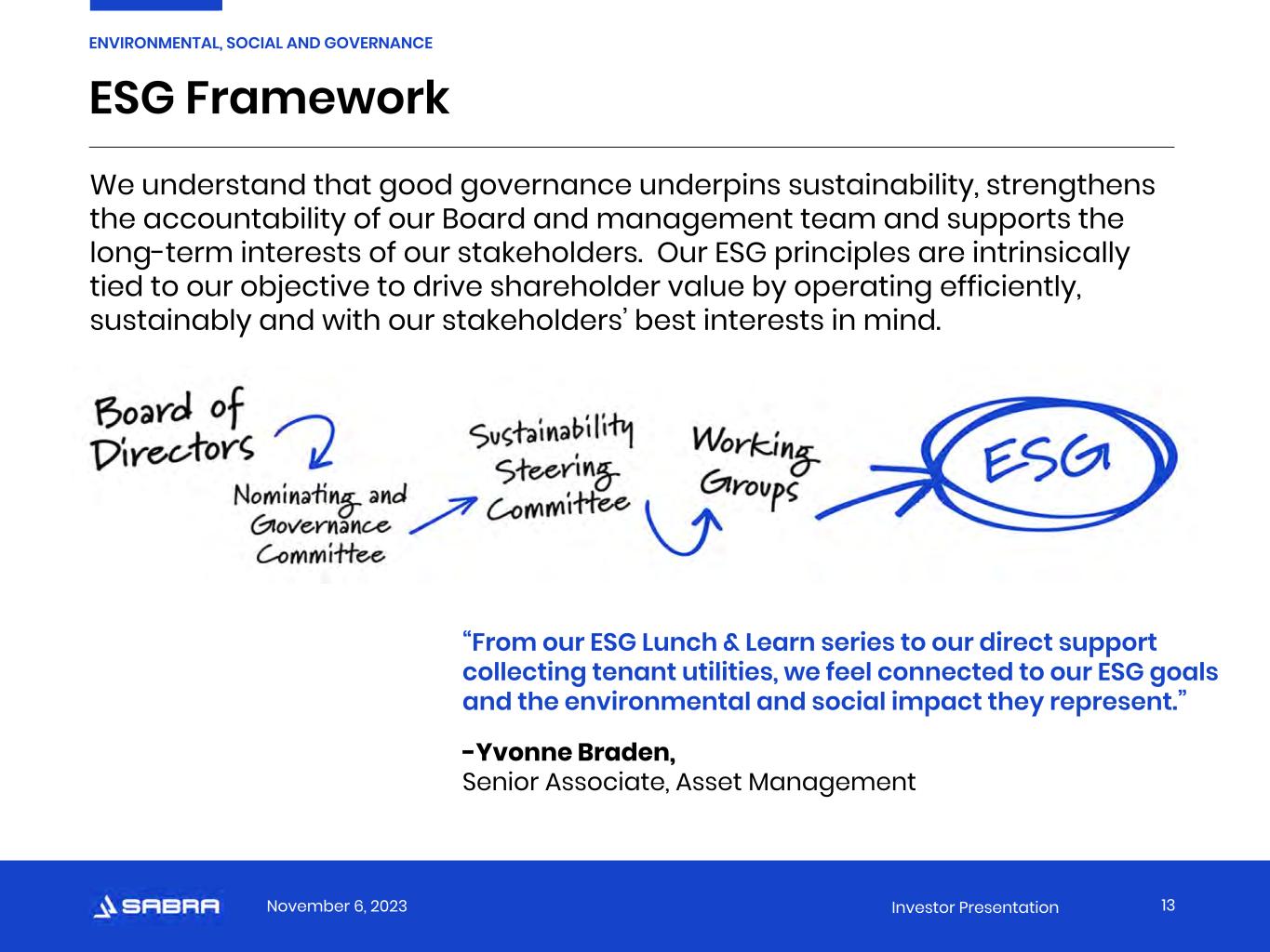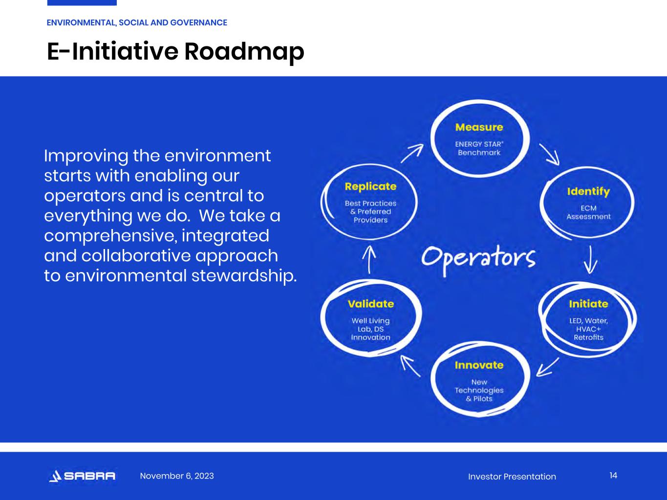 November 6, 2023 Investor Presentation Good for the Planet. Good for Our Stakeholders. Learn more about our commitment to strong corporate governance and our ongoing ESG efforts in our latest corporate sustainability report available on our website at sabrahealth.com. “The question for us is not how important our ESG principles are, but rather how we can effectively and efficiently integrate them into our business strategy in ways that are self-sustaining and accretive.” -Rick Matros (he/him), Chief Executive Officer 12 ENVIRONMENTAL, SOCIAL AND GOVERNANCE