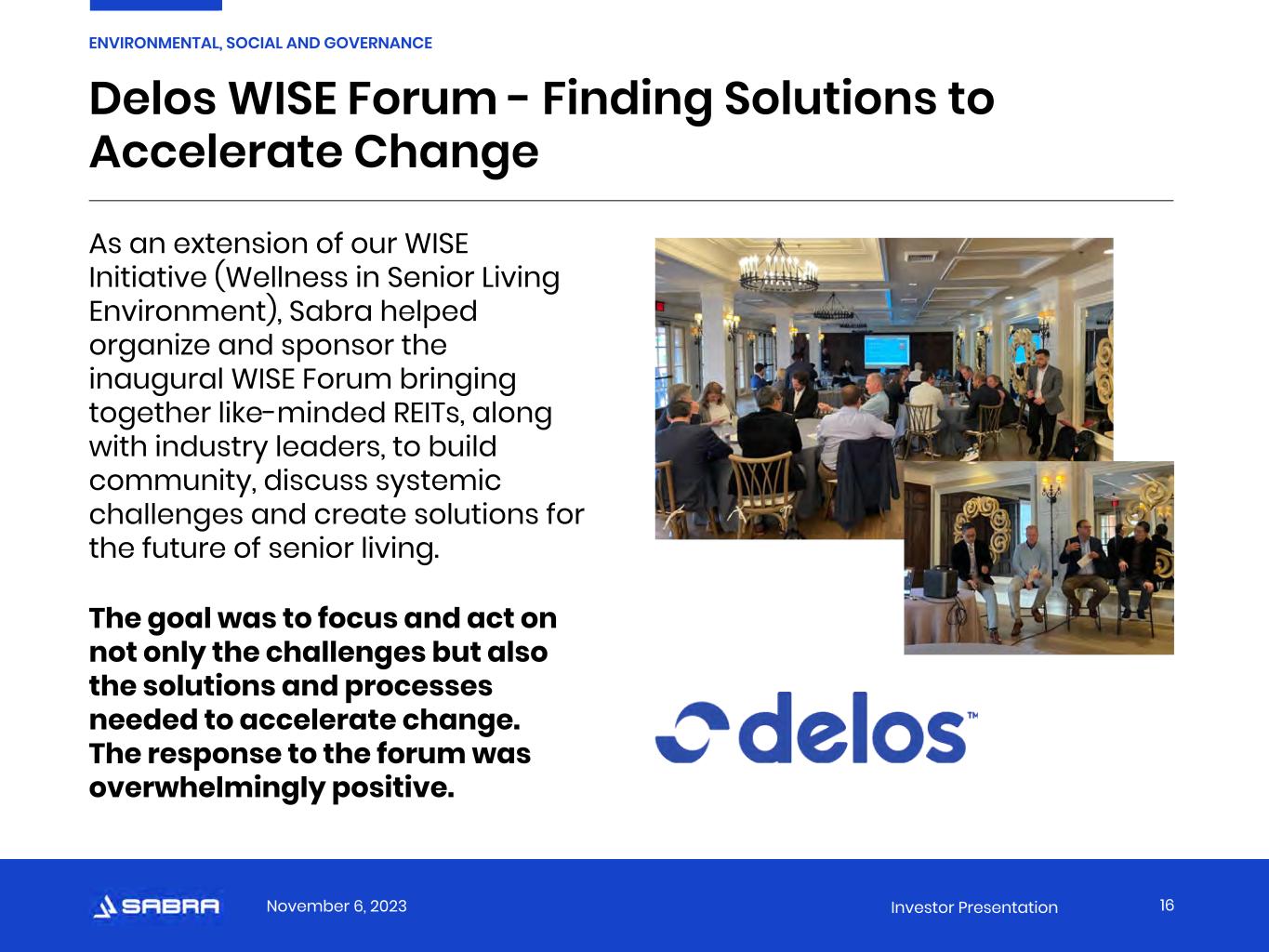 November 6, 2023 Investor Presentation Delos WISE Forum - Finding Solutions to Accelerate Change 16 ENVIRONMENTAL, SOCIAL AND GOVERNANCE As an extension of our WISE Initiative (Wellness in Senior Living Environment), Sabra helped organize and sponsor the inaugural WISE Forum bringing together like-minded REITs, along with industry leaders, to build community, discuss systemic challenges and create solutions for the future of senior living. The goal was to focus and act on not only the challenges but also the solutions and processes needed to accelerate change. The response to the forum was overwhelmingly positive.
