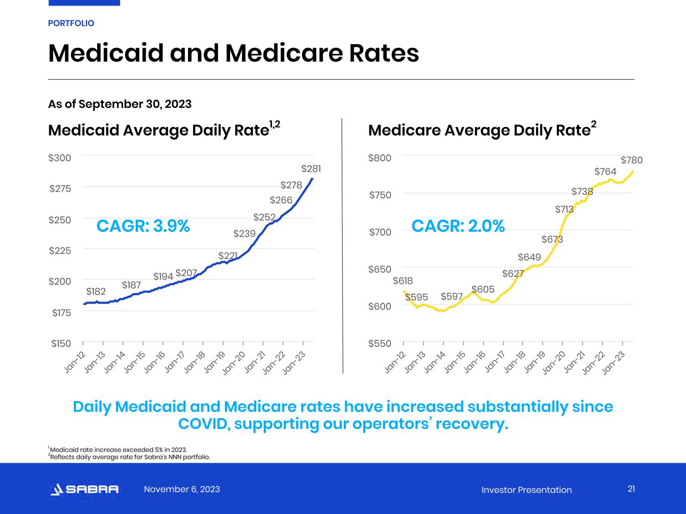November 6, 2023 Investor Presentation Historical SNF Supply 20 PORTFOLIO SNF Supply and Demand 1,795 1,769 1,744 1,716 1,704 1,703 1,703 1,694 1,690 1,687 1,639 1,617 4,296 4,512 4,783 5,121 5,444 5,753 5,905 6,166 6,380 6,539 6,701 6,923 SNF Beds (000s) Population 85 or older (000s) 2000 2001 2002 2003 2004 2005 2006 2007 2008 2009 2010 2011 2012 2013 2014 2015 2016 2017 2018 2019 2020 2021 2022 — 1,000 2,000 3,000 4,000 5,000 6,000 7,000 8,000 Source: Census.gov, AHCA Since 2000, the 85-or-older population has grown by 60%, compared to a 10% decline in skilled nursing beds over the same time frame.