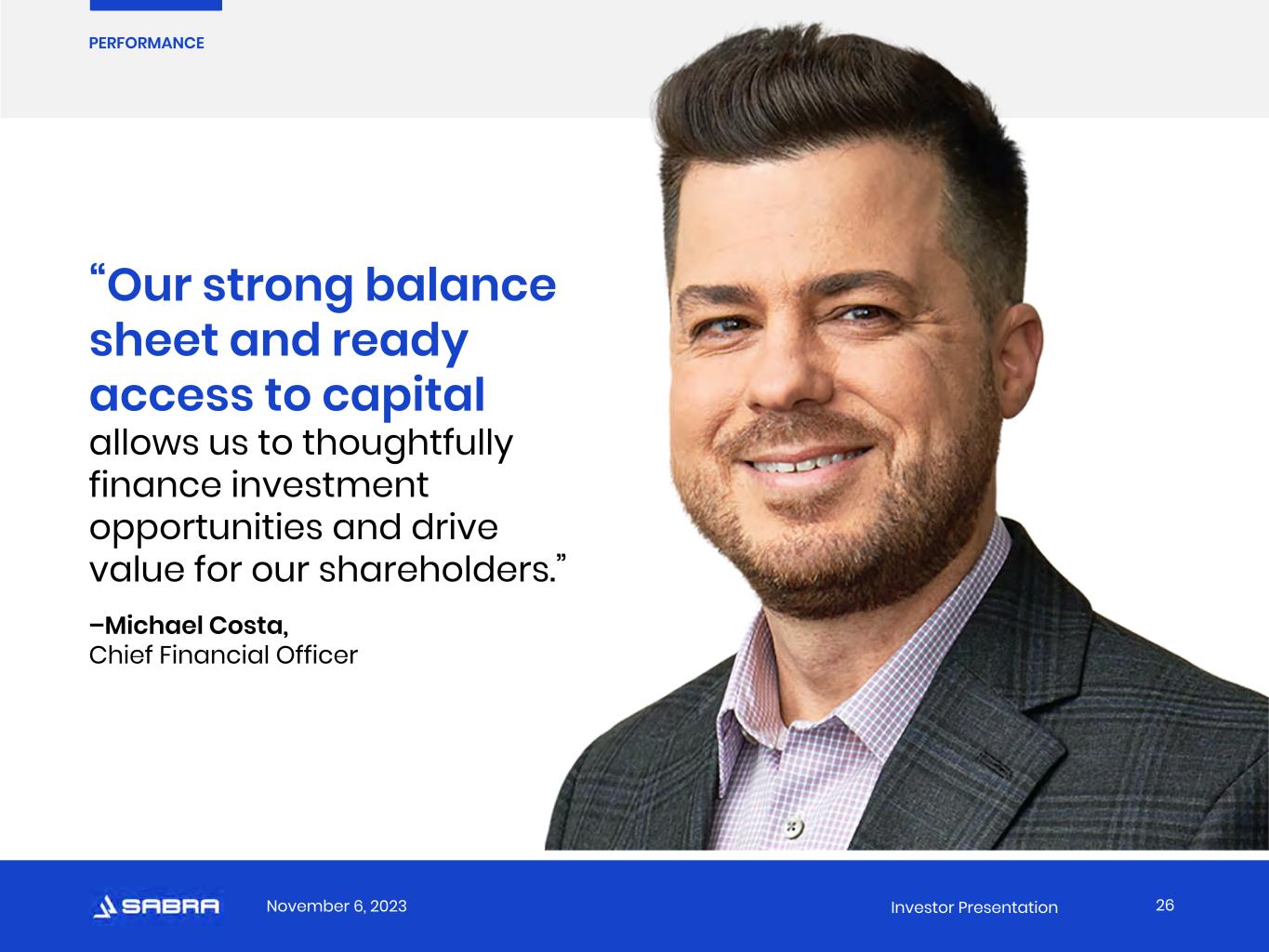 November 6, 2023 Investor Presentation “Our strong balance sheet and ready access to capital allows us to thoughtfully finance investment opportunities and drive value for our shareholders.” –Michael Costa, Chief Financial Officer 26 PERFORMANCE
