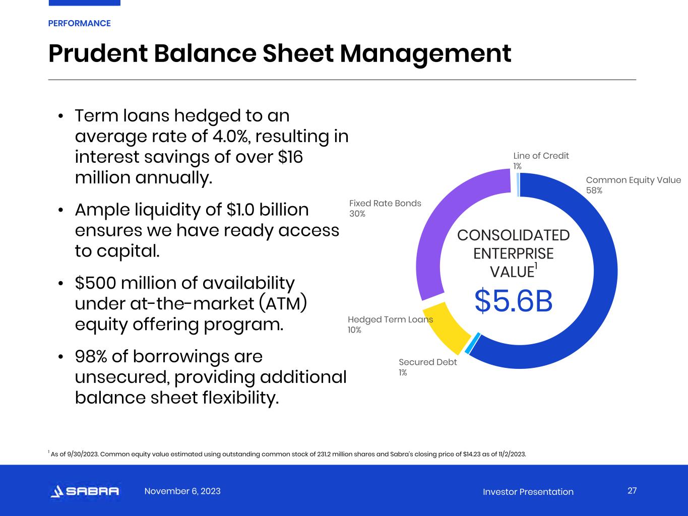 November 6, 2023 Investor Presentation Prudent Balance Sheet Management 1 As of 9/30/2023. Common equity value estimated using outstanding common stock of 231.2 million shares and Sabra’s closing price of $14.23 as of 11/2/2023. 27 PERFORMANCE • Term loans hedged to an average rate of 4.0%, resulting in interest savings of over $16 million annually. • Ample liquidity of $1.0 billion ensures we have ready access to capital. • $500 million of availability under at-the-market (ATM) equity offering program. • 98% of borrowings are unsecured, providing additional balance sheet flexibility. CONSOLIDATED ENTERPRISE VALUE1 $5.6B Common Equity Value 58% Secured Debt 1% Hedged Term Loans 10% Fixed Rate Bonds 30% Line of Credit 1%
