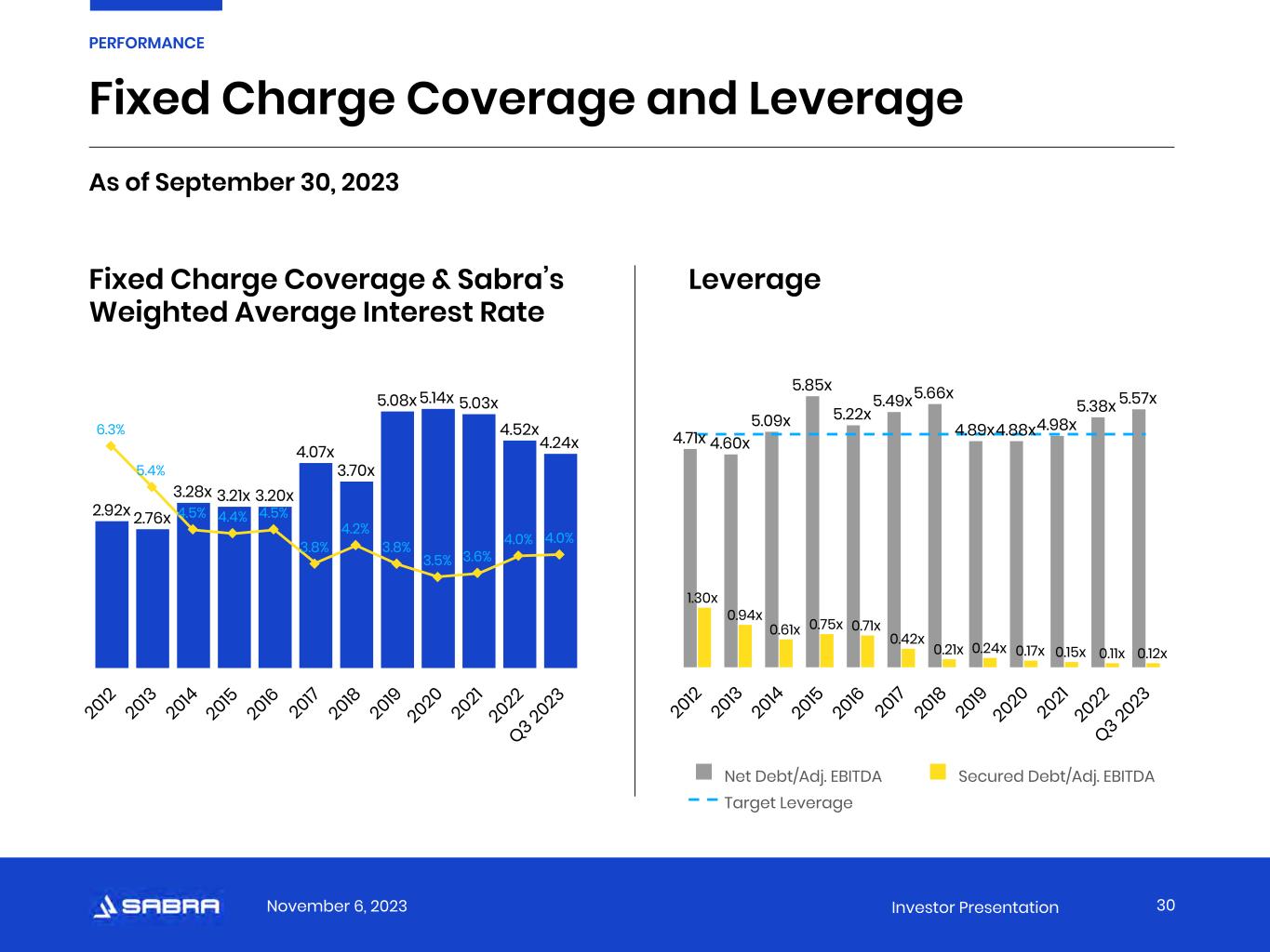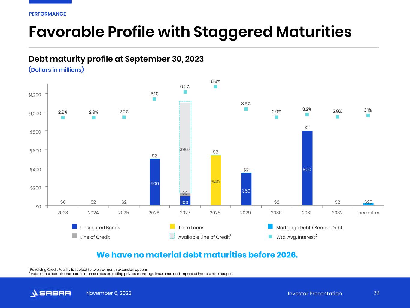 November 6, 2023 Investor Presentation   Sabra 3Q 23 1 Investment-Grade peers median 2 Net Debt to Adjusted EBITDA 5.57x 3 5.07x Interest Coverage Ratio 4.33x 3 3.98x Debt as a % of Asset Value 36% 37% Secured Debt as a % of Asset Value 1% 4% Strong Investment-Grade Credit Metrics 1 Key credit statistics (except Net Debt to Adjusted EBITDA) are calculated in accordance with the credit agreement relating to the revolving credit facility and the indentures relating to our senior unsecured notes. In addition, key credit statistics give effect to dispositions and acquisitions completed after the period presented as though such dispositions and acquisitions occurred at the beginning of the period. 2 Investment-Grade Peers consists of WELL, VTR, OHI and NHI. The metrics used to calculate Investment-Grade Peers Median are sourced from the most recent public filings with the SEC and may not be calculated in a manner identical to Sabra’s metrics. 3 Based on the trailing twelve-month period ended as of the date indicated. 28 PERFORMANCE We continue to focus on strengthening our balance sheet and portfolio without accessing the capital markets.