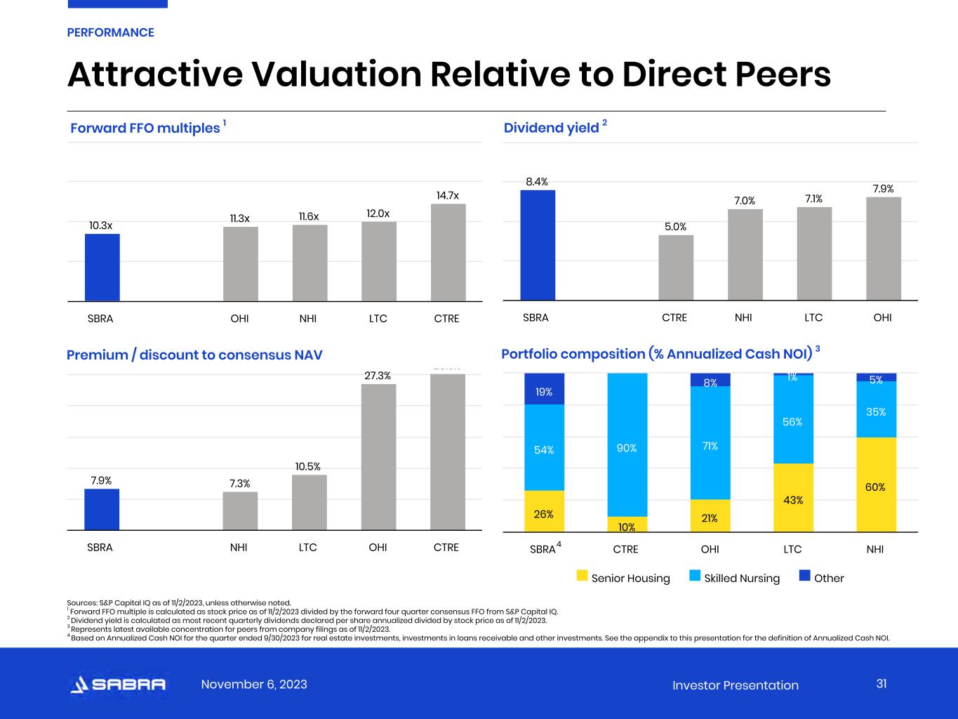 November 6, 2023 Investor Presentation Fixed Charge Coverage and Leverage As of September 30, 2023 30 PERFORMANCE Fixed Charge Coverage & Sabra’s Weighted Average Interest Rate Leverage 2.92x 2.76x 3.28x 3.21x 3.20x 4.07x 3.70x 5.08x 5.14x 5.03x 4.52x 4.24x 6.3% 5.4% 4.5% 4.4% 4.5% 3.8% 4.2% 3.8% 3.5% 3.6% 4.0% 4.0% 2012 2013 2014 2015 2016 2017 2018 2019 2020 2021 2022 Q3 2023 4.71x 4.60x 5.09x 5.85x 5.22x 5.49x5.66x 4.89x4.88x4.98x 5.38x 5.57x 1.30x 0.94x 0.61x 0.75x 0.71x 0.42x 0.21x 0.24x 0.17x 0.15x 0.11x 0.12x Net Debt/Adj. EBITDA Secured Debt/Adj. EBITDA Target Leverage 2012 2013 2014 2015 2016 2017 2018 2019 2020 2021 2022 Q3 2023