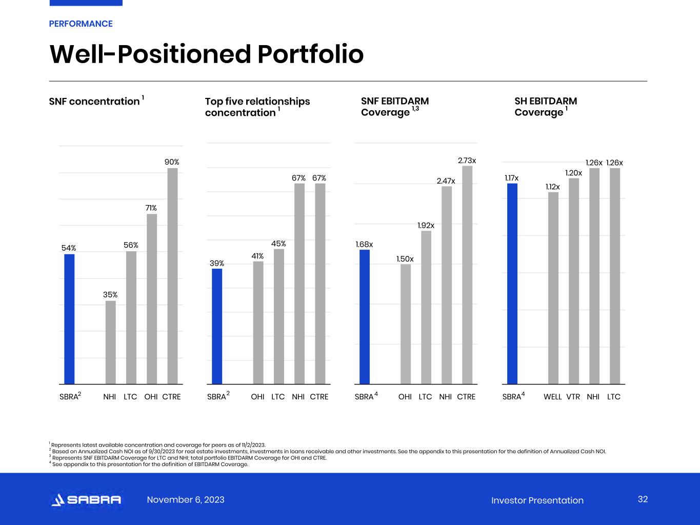 November 6, 2023 Investor Presentation Attractive Valuation Relative to Direct Peers Forward FFO multiples 1 Dividend yield 2 Premium / discount to consensus NAV Portfolio composition (% Annualized Cash NOI) 3 Sources: S&P Capital IQ as of 11/2/2023, unless otherwise noted. 1 Forward FFO multiple is calculated as stock price as of 11/2/2023 divided by the forward four quarter consensus FFO from S&P Capital IQ. 2 Dividend yield is calculated as most recent quarterly dividends declared per share annualized divided by stock price as of 11/2/2023. 3 Represents latest available concentration for peers from company filings as of 11/2/2023. 4 Based on Annualized Cash NOI for the quarter ended 9/30/2023 for real estate investments, investments in loans receivable and other investments. See the appendix to this presentation for the definition of Annualized Cash NOI. 31 PERFORMANCE 10.3x 11.3x 11.6x 12.0x 14.7x SBRA OHI NHI LTC CTRE 8.4% 5.0% 7.0% 7.1% 7.9% SBRA CTRE NHI LTC OHI 7.9% 7.3% 10.5% 27.3% 29.3% SBRA NHI LTC OHI CTRE 26% 10% 21% 43% 60% 54% 90% 71% 56% 35% 19% 8% 1% 5% Senior Housing Skilled Nursing Other SBRA CTRE OHI LTC NHI4