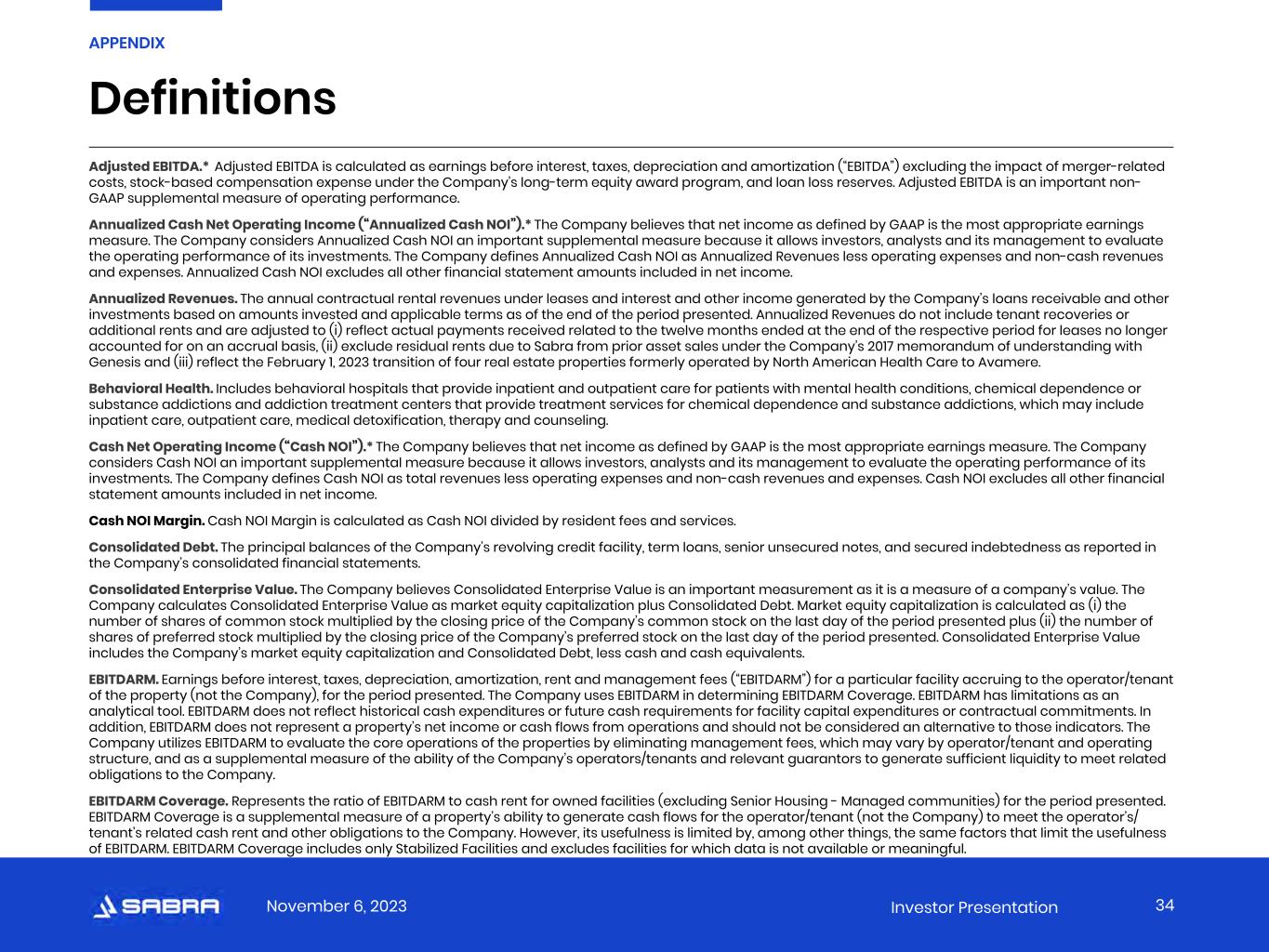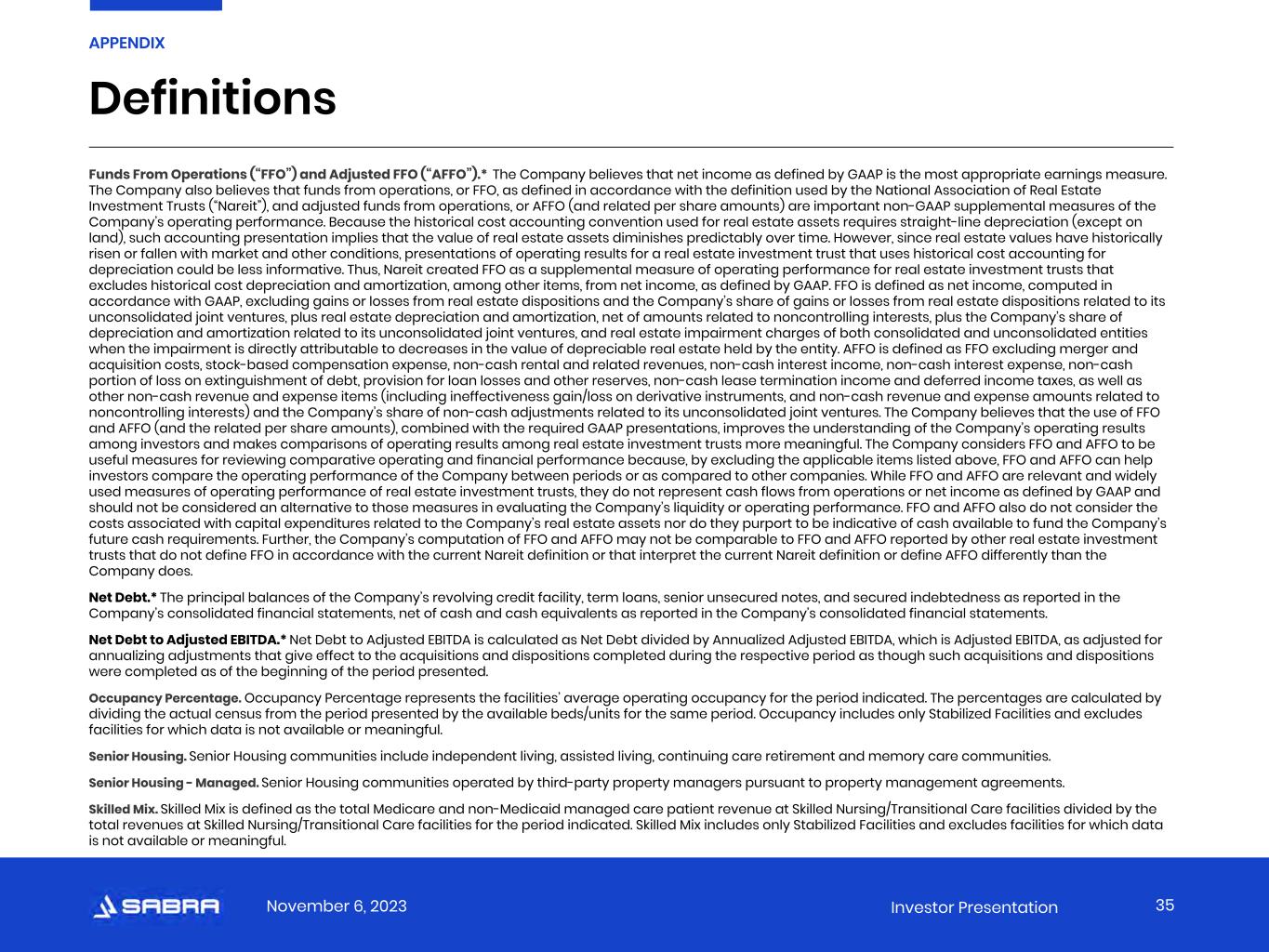 November 6, 2023 Investor Presentation Adjusted EBITDA.* Adjusted EBITDA is calculated as earnings before interest, taxes, depreciation and amortization (“EBITDA”) excluding the impact of merger-related costs, stock-based compensation expense under the Company's long-term equity award program, and loan loss reserves. Adjusted EBITDA is an important non- GAAP supplemental measure of operating performance. Annualized Cash Net Operating Income (“Annualized Cash NOI”).* The Company believes that net income as defined by GAAP is the most appropriate earnings measure. The Company considers Annualized Cash NOI an important supplemental measure because it allows investors, analysts and its management to evaluate the operating performance of its investments. The Company defines Annualized Cash NOI as Annualized Revenues less operating expenses and non-cash revenues and expenses. Annualized Cash NOI excludes all other financial statement amounts included in net income. Annualized Revenues. The annual contractual rental revenues under leases and interest and other income generated by the Company’s loans receivable and other investments based on amounts invested and applicable terms as of the end of the period presented. Annualized Revenues do not include tenant recoveries or additional rents and are adjusted to (i) reflect actual payments received related to the twelve months ended at the end of the respective period for leases no longer accounted for on an accrual basis, (ii) exclude residual rents due to Sabra from prior asset sales under the Company’s 2017 memorandum of understanding with Genesis and (iii) reflect the February 1, 2023 transition of four real estate properties formerly operated by North American Health Care to Avamere. Behavioral Health. Includes behavioral hospitals that provide inpatient and outpatient care for patients with mental health conditions, chemical dependence or substance addictions and addiction treatment centers that provide treatment services for chemical dependence and substance addictions, which may include inpatient care, outpatient care, medical detoxification, therapy and counseling. Cash Net Operating Income (“Cash NOI”).* The Company believes that net income as defined by GAAP is the most appropriate earnings measure. The Company considers Cash NOI an important supplemental measure because it allows investors, analysts and its management to evaluate the operating performance of its investments. The Company defines Cash NOI as total revenues less operating expenses and non-cash revenues and expenses. Cash NOI excludes all other financial statement amounts included in net income. Cash NOI Margin. Cash NOI Margin is calculated as Cash NOI divided by resident fees and services. Consolidated Debt. The principal balances of the Company’s revolving credit facility, term loans, senior unsecured notes, and secured indebtedness as reported in the Company’s consolidated financial statements. Consolidated Enterprise Value. The Company believes Consolidated Enterprise Value is an important measurement as it is a measure of a company’s value. The Company calculates Consolidated Enterprise Value as market equity capitalization plus Consolidated Debt. Market equity capitalization is calculated as (i) the number of shares of common stock multiplied by the closing price of the Company’s common stock on the last day of the period presented plus (ii) the number of shares of preferred stock multiplied by the closing price of the Company’s preferred stock on the last day of the period presented. Consolidated Enterprise Value includes the Company’s market equity capitalization and Consolidated Debt, less cash and cash equivalents. EBITDARM. Earnings before interest, taxes, depreciation, amortization, rent and management fees (“EBITDARM”) for a particular facility accruing to the operator/tenant of the property (not the Company), for the period presented. The Company uses EBITDARM in determining EBITDARM Coverage. EBITDARM has limitations as an analytical tool. EBITDARM does not reflect historical cash expenditures or future cash requirements for facility capital expenditures or contractual commitments. In addition, EBITDARM does not represent a property’s net income or cash flows from operations and should not be considered an alternative to those indicators. The Company utilizes EBITDARM to evaluate the core operations of the properties by eliminating management fees, which may vary by operator/tenant and operating structure, and as a supplemental measure of the ability of the Company’s operators/tenants and relevant guarantors to generate sufficient liquidity to meet related obligations to the Company. EBITDARM Coverage. Represents the ratio of EBITDARM to cash rent for owned facilities (excluding Senior Housing - Managed communities) for the period presented. EBITDARM Coverage is a supplemental measure of a property’s ability to generate cash flows for the operator/tenant (not the Company) to meet the operator’s/ tenant’s related cash rent and other obligations to the Company. However, its usefulness is limited by, among other things, the same factors that limit the usefulness of EBITDARM. EBITDARM Coverage includes only Stabilized Facilities and excludes facilities for which data is not available or meaningful. Definitions 34 APPENDIX
