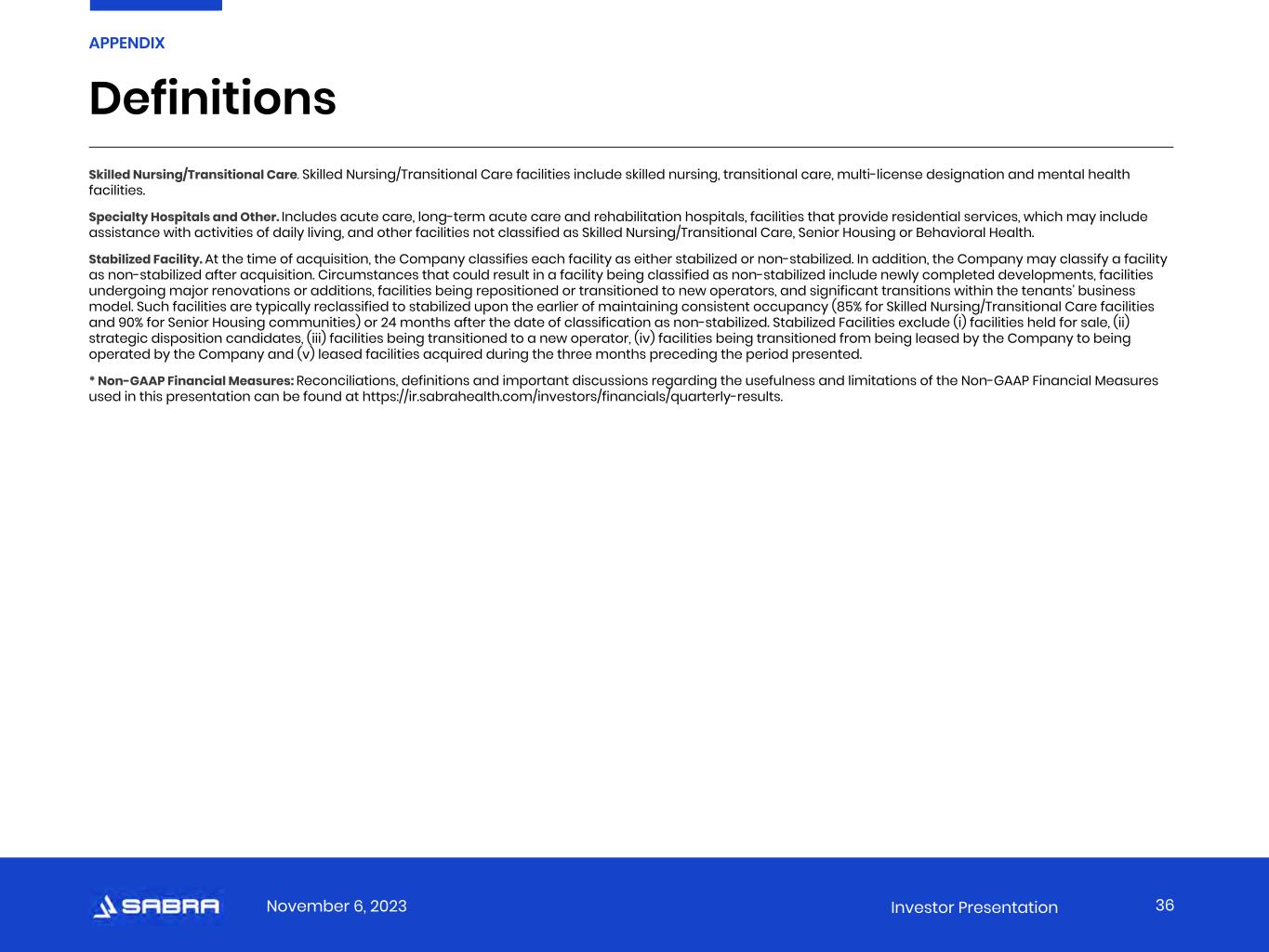 November 6, 2023 Investor Presentation Funds From Operations (“FFO”) and Adjusted FFO (“AFFO”).*  The Company believes that net income as defined by GAAP is the most appropriate earnings measure. The Company also believes that funds from operations, or FFO, as defined in accordance with the definition used by the National Association of Real Estate Investment Trusts (“Nareit”), and adjusted funds from operations, or AFFO (and related per share amounts) are important non-GAAP supplemental measures of the Company’s operating performance. Because the historical cost accounting convention used for real estate assets requires straight-line depreciation (except on land), such accounting presentation implies that the value of real estate assets diminishes predictably over time. However, since real estate values have historically risen or fallen with market and other conditions, presentations of operating results for a real estate investment trust that uses historical cost accounting for depreciation could be less informative. Thus, Nareit created FFO as a supplemental measure of operating performance for real estate investment trusts that excludes historical cost depreciation and amortization, among other items, from net income, as defined by GAAP. FFO is defined as net income, computed in accordance with GAAP, excluding gains or losses from real estate dispositions and the Company’s share of gains or losses from real estate dispositions related to its unconsolidated joint ventures, plus real estate depreciation and amortization, net of amounts related to noncontrolling interests, plus the Company’s share of depreciation and amortization related to its unconsolidated joint ventures, and real estate impairment charges of both consolidated and unconsolidated entities when the impairment is directly attributable to decreases in the value of depreciable real estate held by the entity. AFFO is defined as FFO excluding merger and acquisition costs, stock-based compensation expense, non-cash rental and related revenues, non-cash interest income, non-cash interest expense, non-cash portion of loss on extinguishment of debt, provision for loan losses and other reserves, non-cash lease termination income and deferred income taxes, as well as other non-cash revenue and expense items (including ineffectiveness gain/loss on derivative instruments, and non-cash revenue and expense amounts related to noncontrolling interests) and the Company’s share of non-cash adjustments related to its unconsolidated joint ventures. The Company believes that the use of FFO and AFFO (and the related per share amounts), combined with the required GAAP presentations, improves the understanding of the Company’s operating results among investors and makes comparisons of operating results among real estate investment trusts more meaningful. The Company considers FFO and AFFO to be useful measures for reviewing comparative operating and financial performance because, by excluding the applicable items listed above, FFO and AFFO can help investors compare the operating performance of the Company between periods or as compared to other companies. While FFO and AFFO are relevant and widely used measures of operating performance of real estate investment trusts, they do not represent cash flows from operations or net income as defined by GAAP and should not be considered an alternative to those measures in evaluating the Company’s liquidity or operating performance. FFO and AFFO also do not consider the costs associated with capital expenditures related to the Company’s real estate assets nor do they purport to be indicative of cash available to fund the Company’s future cash requirements. Further, the Company’s computation of FFO and AFFO may not be comparable to FFO and AFFO reported by other real estate investment trusts that do not define FFO in accordance with the current Nareit definition or that interpret the current Nareit definition or define AFFO differently than the Company does. Net Debt.* The principal balances of the Company’s revolving credit facility, term loans, senior unsecured notes, and secured indebtedness as reported in the Company’s consolidated financial statements, net of cash and cash equivalents as reported in the Company’s consolidated financial statements. Net Debt to Adjusted EBITDA.* Net Debt to Adjusted EBITDA is calculated as Net Debt divided by Annualized Adjusted EBITDA, which is Adjusted EBITDA, as adjusted for annualizing adjustments that give effect to the acquisitions and dispositions completed during the respective period as though such acquisitions and dispositions were completed as of the beginning of the period presented. Occupancy Percentage. Occupancy Percentage represents the facilities’ average operating occupancy for the period indicated. The percentages are calculated by dividing the actual census from the period presented by the available beds/units for the same period. Occupancy includes only Stabilized Facilities and excludes facilities for which data is not available or meaningful. Senior Housing. Senior Housing communities include independent living, assisted living, continuing care retirement and memory care communities. Senior Housing - Managed. Senior Housing communities operated by third-party property managers pursuant to property management agreements. Skilled Mix. Skilled Mix is defined as the total Medicare and non-Medicaid managed care patient revenue at Skilled Nursing/Transitional Care facilities divided by the total revenues at Skilled Nursing/Transitional Care facilities for the period indicated. Skilled Mix includes only Stabilized Facilities and excludes facilities for which data is not available or meaningful. Definitions 35 APPENDIX