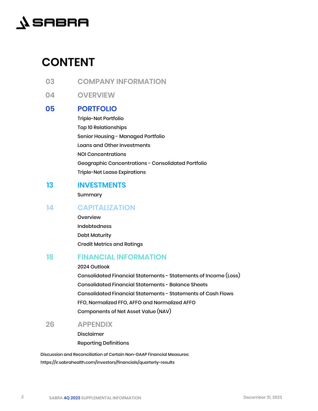 2 SABRA 4Q 2023 SUPPLEMENTAL INFORMATION December 31, 2023 03 COMPANY INFORMATION 04 OVERVIEW 05 PORTFOLIO Triple-Net Portfolio Top 10 Relationships Senior Housing - Managed Portfolio Loans and Other Investments NOI Concentrations Geographic Concentrations - Consolidated Portfolio Triple-Net Lease Expirations 13 INVESTMENTS Summary 14 CAPITALIZATION Overview Indebtedness Debt Maturity Credit Metrics and Ratings 18 FINANCIAL INFORMATION 2024 Outlook Consolidated Financial Statements - Statements of Income (Loss) Consolidated Financial Statements - Balance Sheets Consolidated Financial Statements - Statements of Cash Flows FFO, Normalized FFO, AFFO and Normalized AFFO Components of Net Asset Value (NAV) 26 APPENDIX Disclaimer Reporting Definitions Discussion and Reconciliation of Certain Non-GAAP Financial Measures: CONTENT https://ir.sabrahealth.com/investors/financials/quarterly-results