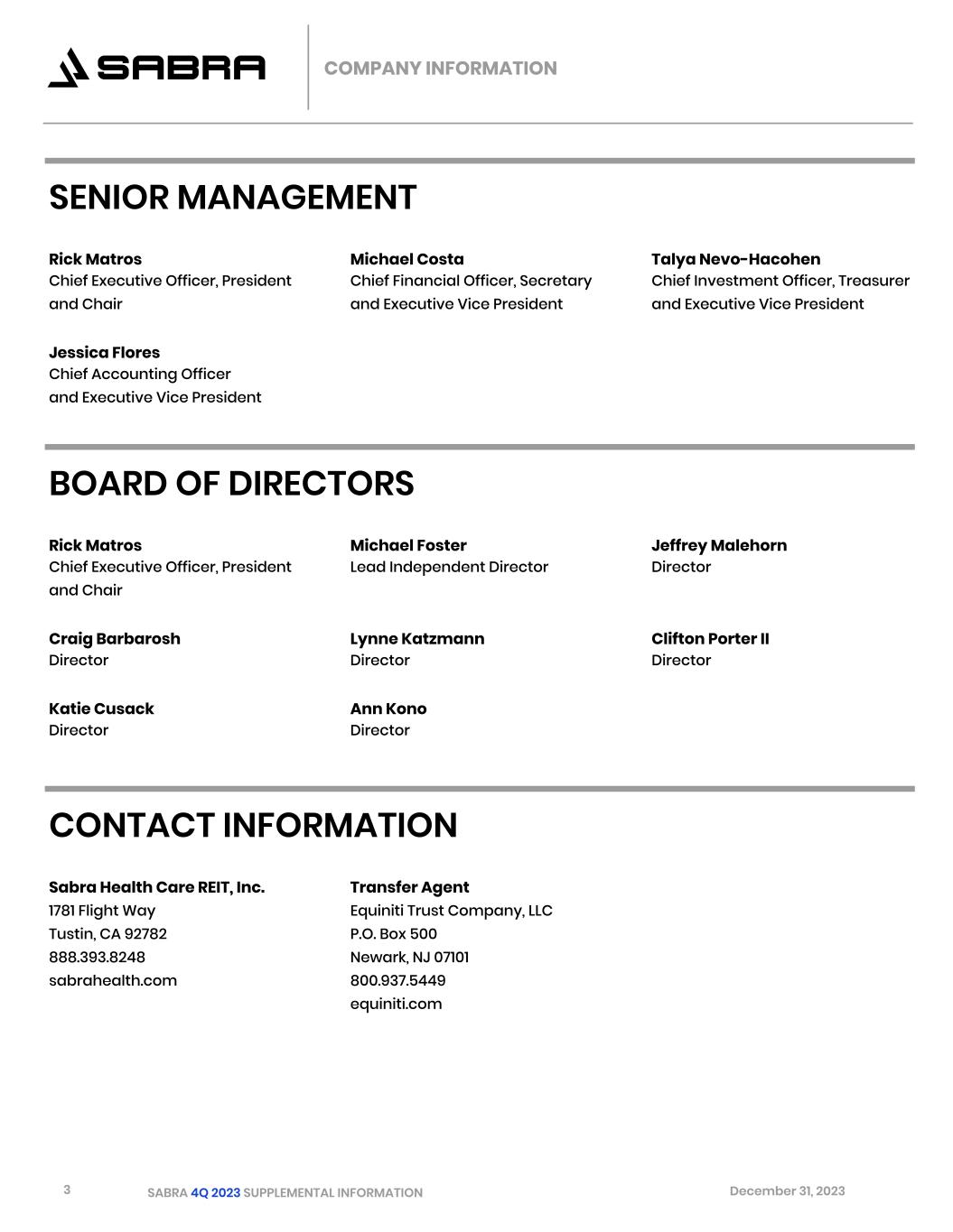 3 SABRA 4Q 2023 SUPPLEMENTAL INFORMATION December 31, 2023 SENIOR MANAGEMENT Rick Matros Michael Costa Talya Nevo-Hacohen Chief Executive Officer, President Chief Financial Officer, Secretary Chief Investment Officer, Treasurer and Chair and Executive Vice President and Executive Vice President Jessica Flores Chief Accounting Officer and Executive Vice President BOARD OF DIRECTORS Rick Matros Michael Foster Jeffrey Malehorn Chief Executive Officer, President Lead Independent Director Director and Chair Craig Barbarosh Lynne Katzmann Clifton Porter II Director Director Director Katie Cusack Ann Kono Director Director CONTACT INFORMATION Sabra Health Care REIT, Inc. Transfer Agent 1781 Flight Way Equiniti Trust Company, LLC Tustin, CA 92782 P.O. Box 500 888.393.8248 Newark, NJ 07101 sabrahealth.com 800.937.5449 equiniti.com COMPANY INFORMATION