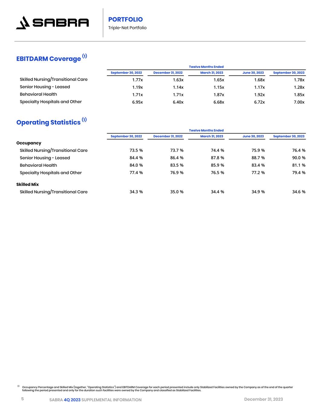 4 SABRA 4Q 2023 SUPPLEMENTAL INFORMATION December 31, 2023 Financial Metrics Dollars in thousands, except per share data December 31, 2023 Three Months Ended Year Ended Revenues $ 163,397 $ 647,514 Net operating income 115,944 462,013 Cash net operating income 114,085 453,163 Diluted per share data: EPS $ 0.07 $ 0.06 FFO 0.30 1.27 Normalized FFO 0.32 1.30 AFFO 0.32 1.33 Normalized AFFO 0.33 1.33 Dividends per common share 0.30 1.20 Capitalization and Market Facts Key Credit Metrics (1) December 31, 2023 December 31, 2023 Common shares outstanding 231.3 million Net Debt to Adjusted EBITDA 5.74x Common equity Market Capitalization $3.3 billion Interest Coverage 4.12x Consolidated Debt $2.4 billion Fixed Charge Coverage Ratio 4.04x Consolidated Enterprise Value $5.7 billion Total Debt/Asset Value 37 % Secured Debt/Asset Value 1 % Common stock closing price $14.27 Unencumbered Assets/Unsecured Debt 267 % Common stock 52-week range $10.08 - $14.82 Common stock ticker symbol SBRA Portfolio Dollars in thousands, units and Cash NOI reflect Sabra's pro rata share Three Months Ended December 31, 2023As of December 31, 2023 Property Count Investment Beds/Units Cash NOI Investment in Real Estate Properties, gross Triple-Net Portfolio: Skilled Nursing/Transitional Care 241 $ 3,050,861 26,769 $ 60,859 Senior Housing - Leased 43 573,274 3,473 10,219 Behavioral Health 18 496,737 1,159 10,753 Specialty Hospitals and Other 15 225,443 392 4,650 Total Triple-Net Portfolio 317 4,346,315 31,793 Senior Housing - Managed 61 1,289,485 6,041 16,067 Consolidated Real Estate Investments 378 5,635,800 37,834 Unconsolidated Joint Venture Senior Housing - Managed 16 207,310 1,256 2,425 Total Equity Investments 394 5,843,110 39,090 Investments in Loans Receivable, gross (2) 14 362,850 Preferred Equity Investments, gross (3) 5 57,849 Includes 63 relationships in 39 U.S. states and CanadaTotal Investments 413 $ 6,263,809 (1) See page 17 of this supplement for important information about these credit metrics. (2) Our loans receivable investments include one investment which has a right of first offer on six addiction treatment centers with 928 beds. (3) Our preferred equity investments include investments in entities owning four Senior Housing developments with 544 aggregate units and one Skilled Nursing/Transitional Care development with 120 beds. OVERVIEW