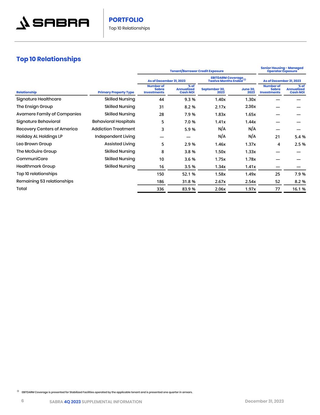 5 SABRA 4Q 2023 SUPPLEMENTAL INFORMATION December 31, 2023 Operating Statistics (1) Twelve Months Ended September 30, 2022 December 31, 2022 March 31, 2023 June 30, 2023 September 30, 2023 Occupancy Skilled Nursing/Transitional Care 73.5 % 73.7 % 74.4 % 75.9 % 76.4 % Senior Housing - Leased 84.4 % 86.4 % 87.8 % 88.7 % 90.0 % Behavioral Health 84.0 % 83.5 % 85.9 % 83.4 % 81.1 % Specialty Hospitals and Other 77.4 % 76.9 % 76.5 % 77.2 % 79.4 % Skilled Mix Skilled Nursing/Transitional Care 34.3 % 35.0 % 34.4 % 34.9 % 34.6 % PORTFOLIO Triple-Net Portfolio (1) Occupancy Percentage and Skilled Mix (together, “Operating Statistics”) and EBITDARM Coverage for each period presented include only Stabilized Facilities owned by the Company as of the end of the quarter following the period presented and only for the duration such facilities were owned by the Company and classified as Stabilized Facilities. EBITDARM Coverage (1) Twelve Months Ended September 30, 2022 December 31, 2022 March 31, 2023 June 30, 2023 September 30, 2023 Skilled Nursing/Transitional Care 1.77x 1.63x 1.65x 1.68x 1.78x Senior Housing - Leased 1.19x 1.14x 1.15x 1.17x 1.28x Behavioral Health 1.71x 1.71x 1.87x 1.92x 1.85x Specialty Hospitals and Other 6.95x 6.40x 6.68x 6.72x 7.00x