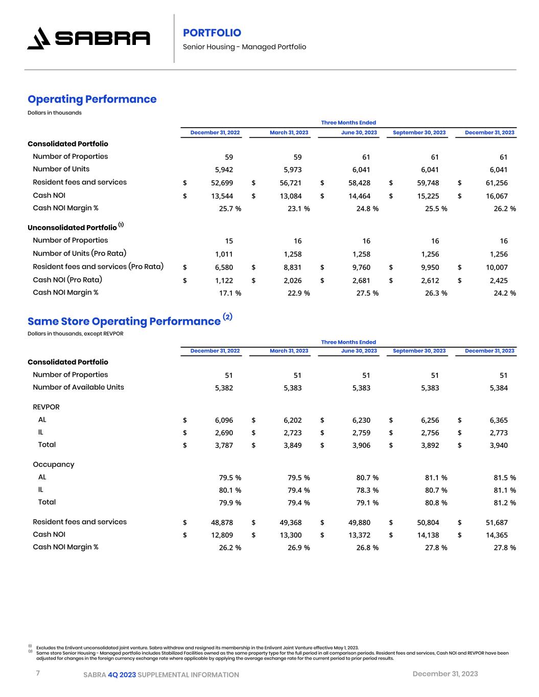 7 SABRA 4Q 2023 SUPPLEMENTAL INFORMATION December 31, 2023 PORTFOLIO Senior Housing - Managed Portfolio (1) Excludes the Enlivant unconsolidated joint venture. Sabra withdrew and resigned its membership in the Enlivant Joint Venture effective May 1, 2023. (2) Same store Senior Housing - Managed portfolio includes Stabilized Facilities owned as the same property type for the full period in all comparison periods. Resident fees and services, Cash NOI and REVPOR have been adjusted for changes in the foreign currency exchange rate where applicable by applying the average exchange rate for the current period to prior period results. Operating Performance Dollars in thousands Three Months Ended December 31, 2022 March 31, 2023 June 30, 2023 September 30, 2023 December 31, 2023 Consolidated Portfolio Number of Properties 59 59 61 61 61 Number of Units 5,942 5,973 6,041 6,041 6,041 Resident fees and services $ 52,699 $ 56,721 $ 58,428 $ 59,748 $ 61,256 Cash NOI $ 13,544 $ 13,084 $ 14,464 $ 15,225 $ 16,067 Cash NOI Margin % 25.7 % 23.1 % 24.8 % 25.5 % 26.2 % Unconsolidated Portfolio (1) Number of Properties 15 16 16 16 16 Number of Units (Pro Rata) 1,011 1,258 1,258 1,256 1,256 Resident fees and services (Pro Rata) $ 6,580 $ 8,831 $ 9,760 $ 9,950 $ 10,007 Cash NOI (Pro Rata) $ 1,122 $ 2,026 $ 2,681 $ 2,612 $ 2,425 Cash NOI Margin % 17.1 % 22.9 % 27.5 % 26.3 % 24.2 % Same Store Operating Performance (2) Dollars in thousands, except REVPOR Three Months Ended December 31, 2022 March 31, 2023 June 30, 2023 September 30, 2023 December 31, 2023 Consolidated Portfolio Number of Properties 51 51 51 51 51 Number of Available Units 5,382 5,383 5,383 5,383 5,384 REVPOR AL $ 6,096 $ 6,202 $ 6,230 $ 6,256 $ 6,365 IL $ 2,690 $ 2,723 $ 2,759 $ 2,756 $ 2,773 Total $ 3,787 $ 3,849 $ 3,906 $ 3,892 $ 3,940 Occupancy AL 79.5 % 79.5 % 80.7 % 81.1 % 81.5 % IL 80.1 % 79.4 % 78.3 % 80.7 % 81.1 % Total 79.9 % 79.4 % 79.1 % 80.8 % 81.2 % Resident fees and services $ 48,878 $ 49,368 $ 49,880 $ 50,804 $ 51,687 Cash NOI $ 12,809 $ 13,300 $ 13,372 $ 14,138 $ 14,365 Cash NOI Margin % 26.2 % 26.9 % 26.8 % 27.8 % 27.8 %