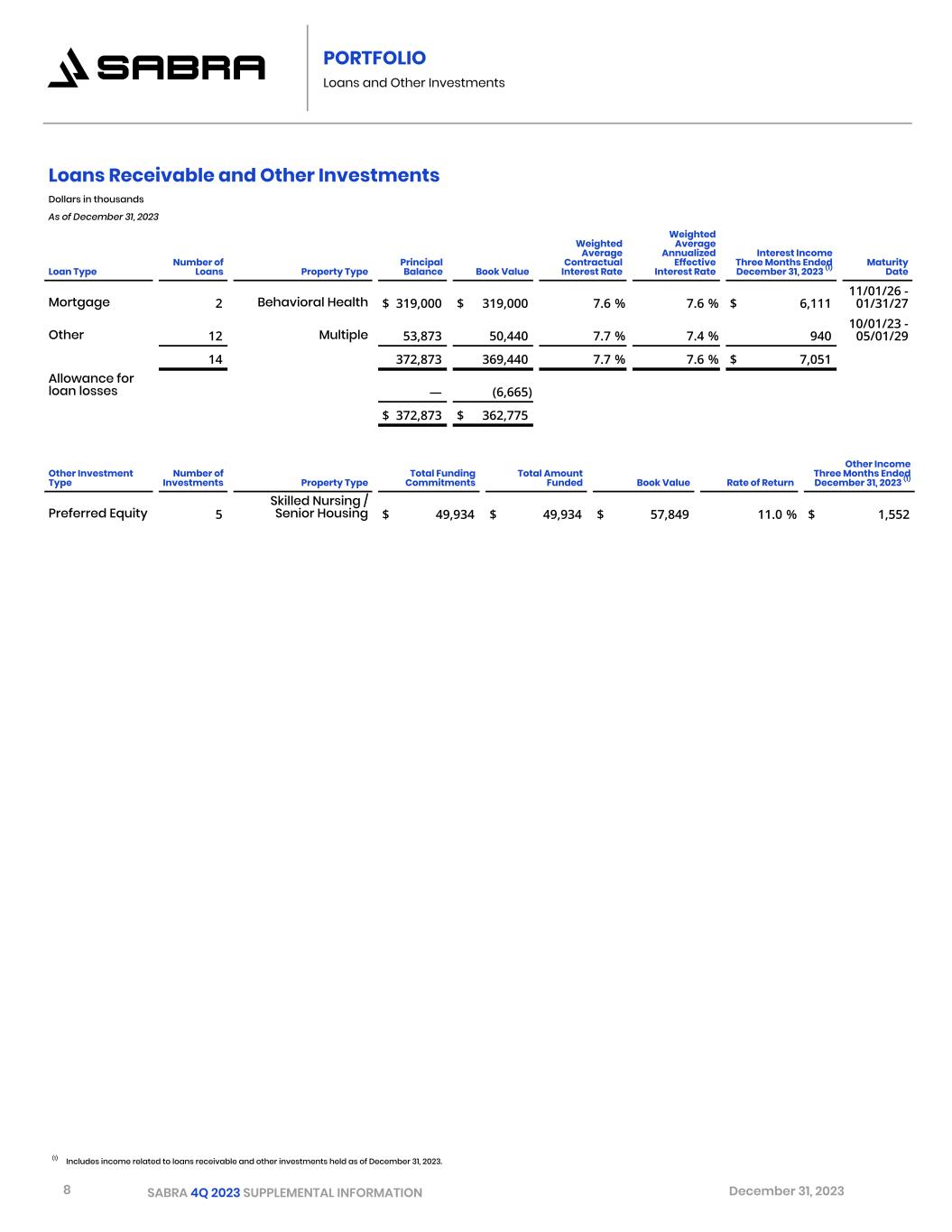8 SABRA 4Q 2023 SUPPLEMENTAL INFORMATION December 31, 2023 PORTFOLIO Loans and Other Investments Loans Receivable and Other Investments Dollars in thousands As of December 31, 2023 Loan Type Number of Loans Property Type Principal Balance Book Value Weighted Average Contractual Interest Rate Weighted Average Annualized Effective Interest Rate Interest Income Three Months Ended December 31, 2023 (1) Maturity Date Mortgage 2 Behavioral Health $ 319,000 $ 319,000 7.6 % 7.6 % $ 6,111 11/01/26 - 01/31/27 Other 12 Multiple 53,873 50,440 7.7 % 7.4 % 940 10/01/23 - 05/01/29 14 372,873 369,440 7.7 % 7.6 % $ 7,051 Allowance for loan losses — (6,665) $ 372,873 $ 362,775 Other Investment Type Number of Investments Property Type Total Funding Commitments Total Amount Funded Book Value Rate of Return Other Income Three Months Ended December 31, 2023 (1) Preferred Equity 5 Skilled Nursing / Senior Housing $ 49,934 $ 49,934 $ 57,849 11.0 % $ 1,552 (1) Includes income related to loans receivable and other investments held as of December 31, 2023.