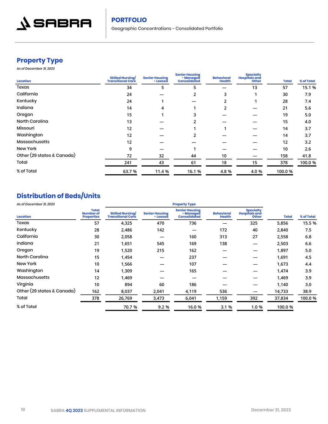 11 SABRA 4Q 2023 SUPPLEMENTAL INFORMATION December 31, 2023 PORTFOLIO Geographic Concentrations - Consolidated Portfolio Continued Investment Dollars in thousands As of December 31, 2023   Property Type Location Total Number of Properties Skilled Nursing/ Transitional Care Senior Housing - Leased Senior Housing - Managed Consolidated    Behavioral Health Specialty Hospitals and Other    Total % of Total Texas 57 $ 347,245 $ 55,818 $ 173,043 $ — $ 187,387 $ 763,493 13.5 % California 30 435,612 — 59,434 217,764 7,743 720,553 12.8 Indiana 21 196,544 120,197 47,861 12,155 — 376,757 6.7 Oregon 19 261,316 33,002 54,214 — — 348,532 6.2 New York 10 298,004 — 20,688 — — 318,692 5.8 Kentucky 28 244,385 23,668 — 15,165 30,313 313,531 5.6 Washington 14 158,674 — 41,142 — — 199,816 3.5 North Carolina 15 124,449 — 75,251 — — 199,700 3.5 Arizona 5 — 10,348 39,656 121,757 — 171,761 3.0 Canada (1) 9 — — 159,550 — — 159,550 2.8 Other (30 states) 170 984,632 330,241 618,646 129,896 — 2,063,415 36.6 Total 378 $ 3,050,861 $ 573,274 $ 1,289,485 $ 496,737 $ 225,443 $ 5,635,800 100.0 % % of Total 54.1 % 10.2 % 22.9 % 8.8 % 4.0 % 100.0 % (1) Investment balance in Canada is based on the exchange rate as of December 31, 2023 of $0.7546 per 1 CAD.
