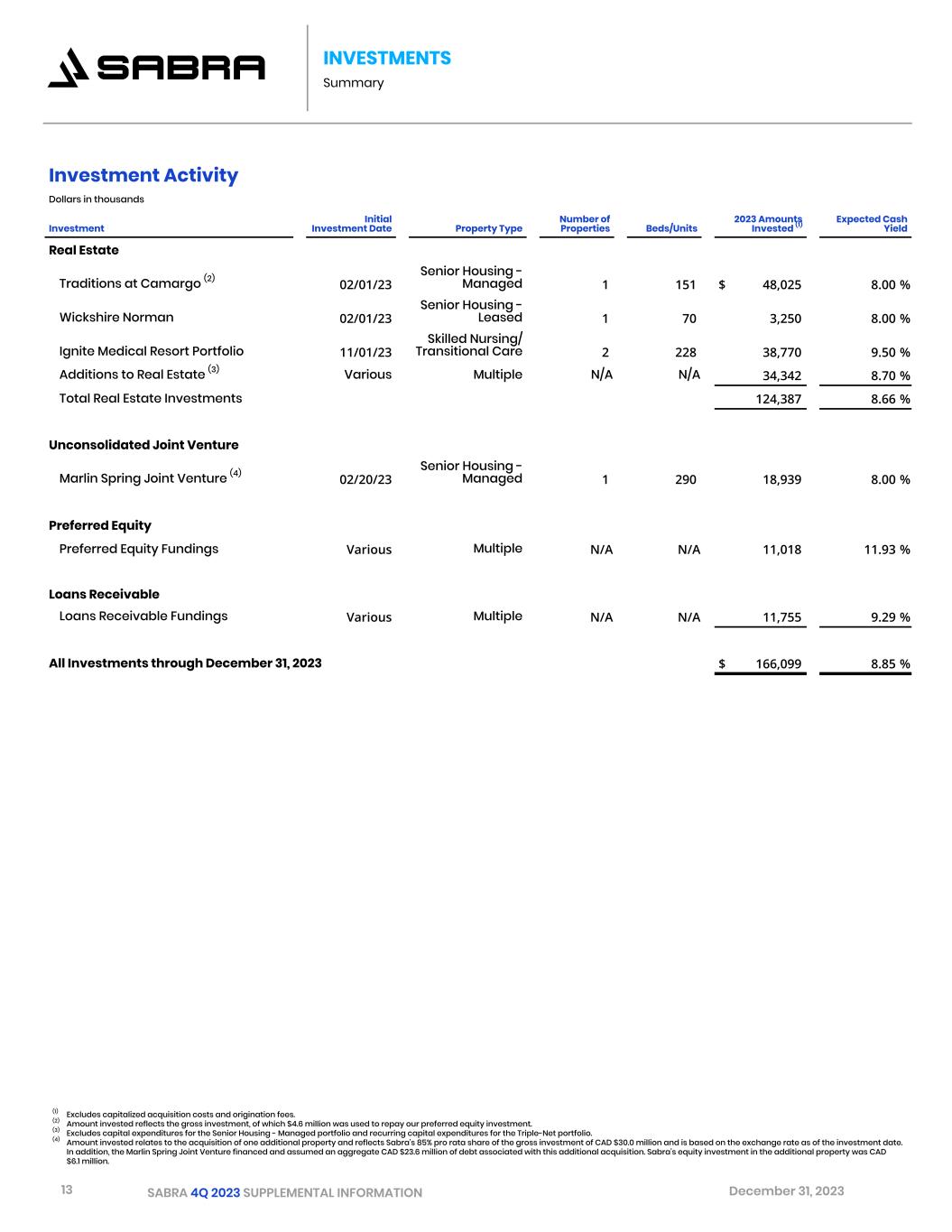 13 SABRA 4Q 2023 SUPPLEMENTAL INFORMATION December 31, 2023 INVESTMENTS Summary Investment Activity Dollars in thousands Investment Initial Investment Date Property Type Number of Properties Beds/Units 2023 Amounts Invested (1) Expected Cash Yield Real Estate Traditions at Camargo (2) 02/01/23 Senior Housing - Managed 1 151 $ 48,025 8.00 % Wickshire Norman 02/01/23 Senior Housing - Leased 1 70 3,250 8.00 % Ignite Medical Resort Portfolio 11/01/23 Skilled Nursing/ Transitional Care 2 228 38,770 9.50 % Additions to Real Estate (3) Various Multiple N/A N/A 34,342 8.70 % Total Real Estate Investments 124,387 8.66 % Unconsolidated Joint Venture Marlin Spring Joint Venture (4) 02/20/23 Senior Housing - Managed 1 290 18,939 8.00 % Preferred Equity Preferred Equity Fundings Various Multiple N/A N/A 11,018 11.93 % Loans Receivable Loans Receivable Fundings Various Multiple N/A N/A 11,755 9.29 % All Investments through December 31, 2023 $ 166,099 8.85 % (1) Excludes capitalized acquisition costs and origination fees. (2) Amount invested reflects the gross investment, of which $4.6 million was used to repay our preferred equity investment. (3) Excludes capital expenditures for the Senior Housing - Managed portfolio and recurring capital expenditures for the Triple-Net portfolio. (4) Amount invested relates to the acquisition of one additional property and reflects Sabra's 85% pro rata share of the gross investment of CAD $30.0 million and is based on the exchange rate as of the investment date. In addition, the Marlin Spring Joint Venture financed and assumed an aggregate CAD $23.6 million of debt associated with this additional acquisition. Sabra's equity investment in the additional property was CAD $6.1 million.