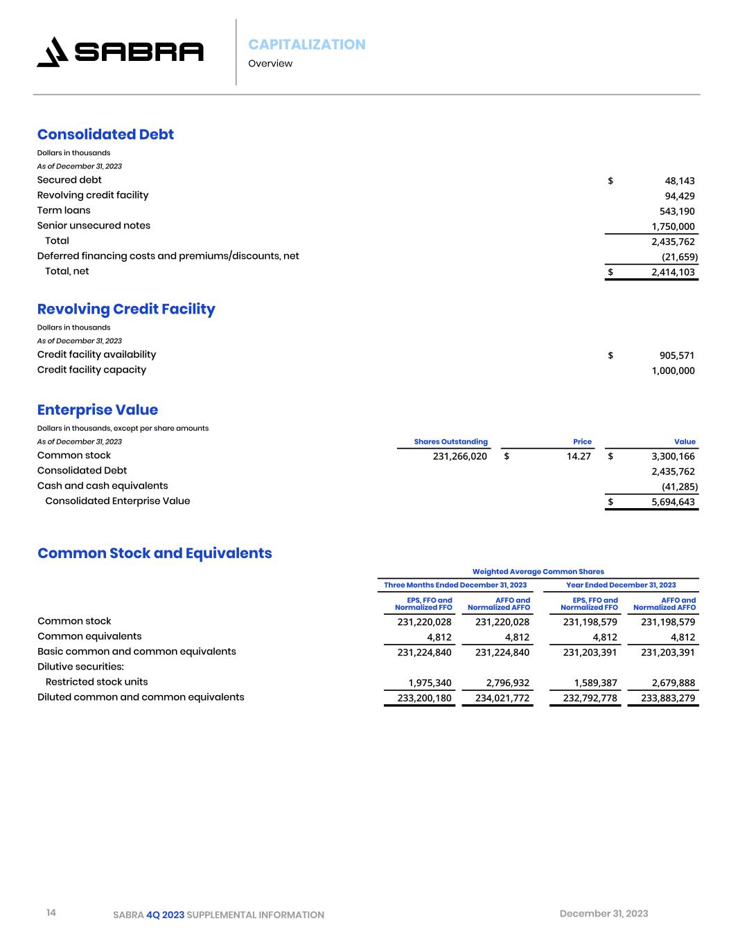 14 SABRA 4Q 2023 SUPPLEMENTAL INFORMATION December 31, 2023 CAPITALIZATION Overview Consolidated Debt Dollars in thousands As of December 31, 2023 Secured debt $ 48,143 Revolving credit facility 94,429 Term loans 543,190 Senior unsecured notes 1,750,000 Total 2,435,762 Deferred financing costs and premiums/discounts, net (21,659) Total, net $ 2,414,103 Revolving Credit Facility Dollars in thousands As of December 31, 2023 Credit facility availability $ 905,571 Credit facility capacity 1,000,000 Enterprise Value Dollars in thousands, except per share amounts As of December 31, 2023 Shares Outstanding   Price   Value Common stock 231,266,020 $ 14.27 $ 3,300,166 Consolidated Debt 2,435,762 Cash and cash equivalents (41,285) Consolidated Enterprise Value $ 5,694,643 Common Stock and Equivalents Weighted Average Common Shares Three Months Ended December 31, 2023 Year Ended December 31, 2023 EPS, FFO and Normalized FFO AFFO and Normalized AFFO EPS, FFO and Normalized FFO AFFO and Normalized AFFO Common stock 231,220,028 231,220,028 231,198,579 231,198,579 Common equivalents 4,812 4,812 4,812 4,812 Basic common and common equivalents 231,224,840 231,224,840 231,203,391 231,203,391 Dilutive securities: Restricted stock units 1,975,340 2,796,932 1,589,387 2,679,888 Diluted common and common equivalents 233,200,180 234,021,772 232,792,778 233,883,279