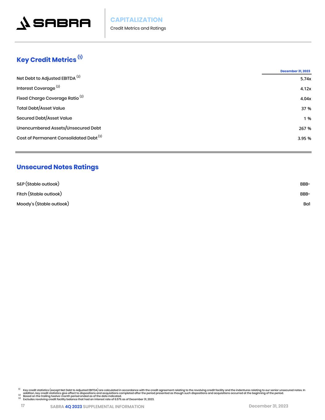 16 SABRA 4Q 2023 SUPPLEMENTAL INFORMATION December 31, 2023 CAPITALIZATION Debt Maturity Debt Maturity Schedule Dollars in thousands Secured Debt Senior Unsecured Notes   Term Loans     Revolving Credit Facility (1) Consolidated Debt As of December 31, 2023 Principal Rate (2) Principal Rate (2)   Principal Rate (2)     Principal Rate (2) Principal Rate (2) 2024 $ 2,033   2.85 %   $ —   —     $ —   —     $ — — $ 2,033   2.85 % 2025 2,089   2.86 %   —   —     —   —     — — 2,089   2.86 % 2026 2,147   2.86 %   500,000   5.13 %     —   —     — — 502,147   5.12 % 2027 2,206   2.87 %   100,000   5.88 % —   —     94,429 6.57 % 196,635   6.18 % 2028 2,266   2.88 %   —   — 543,190   6.72 %     — — 545,456   6.71 % 2029 2,328   2.89 %   350,000   3.90 %     —   —     — — 352,328   3.89 % 2030 2,392   2.90 %   — — —   —     — — 2,392   2.90 % 2031 2,093   2.92 %   800,000   3.20 %     —   —     — — 802,093   3.20 % 2032 1,887   2.92 %   —   —     —   —     — — 1,887   2.92 % 2033 1,940   2.93 % — — — — — — 1,940 2.93 % Thereafter 26,762   3.10 %   —   —     —   —     — — 26,762   3.10 % Total 48,143   1,750,000 543,190     94,429 2,435,762 Discount, net — (4,258) — — (4,258) Deferred financing costs, net (842) (10,489) (6,070) — (17,401) Total, net $ 47,301 $ 1,735,253 $ 537,120     $ 94,429 $ 2,414,103 Wtd. avg. maturity/years 21.0   5.7 4.0     3.0 5.5 Wtd. avg. interest rate (3) 3.34 %   4.04 % 3.72 %     6.57 % 4.05 % (1) Revolving Credit Facility is subject to two six-month extension options. (2) Represents actual contractual interest rates excluding private mortgage insurance and impact of interest rate hedges. (3) Weighted average interest rate includes private mortgage insurance and impact of interest rate hedges.