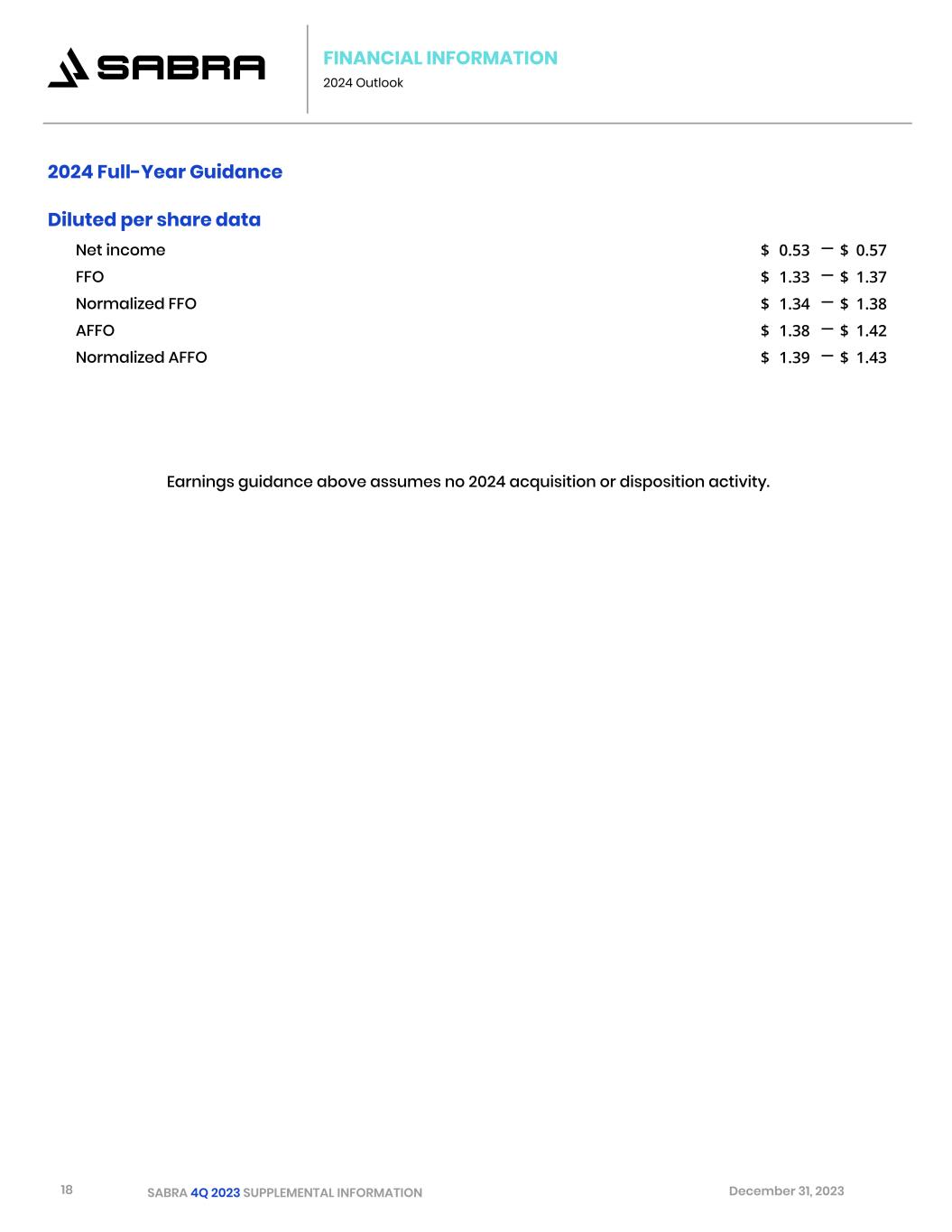 18 SABRA 4Q 2023 SUPPLEMENTAL INFORMATION December 31, 2023 2024 Full-Year Guidance   Diluted per share data Net income $ 0.53 — $ 0.57 FFO $ 1.33 — $ 1.37 Normalized FFO $ 1.34 — $ 1.38 AFFO $ 1.38 — $ 1.42 Normalized AFFO $ 1.39 — $ 1.43 FINANCIAL INFORMATION 2024 Outlook Earnings guidance above assumes no 2024 acquisition or disposition activity.