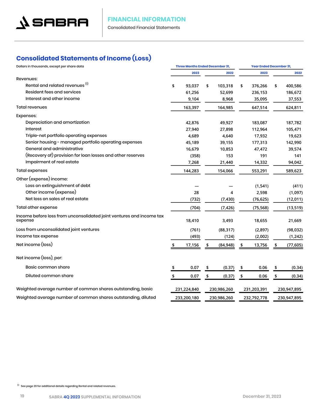 19 SABRA 4Q 2023 SUPPLEMENTAL INFORMATION December 31, 2023 FINANCIAL INFORMATION Consolidated Financial Statements Consolidated Statements of Income (Loss) Dollars in thousands, except per share data Three Months Ended December 31, Year Ended December 31,   2023 2022 2023 2022 Revenues: Rental and related revenues (1) $ 93,037 $ 103,318 $ 376,266 $ 400,586 Resident fees and services 61,256 52,699 236,153 186,672 Interest and other income 9,104 8,968 35,095 37,553       Total revenues 163,397 164,985 647,514 624,811     Expenses: Depreciation and amortization 42,876 49,927 183,087 187,782 Interest 27,940 27,898 112,964 105,471 Triple-net portfolio operating expenses 4,689 4,640 17,932 19,623 Senior housing - managed portfolio operating expenses 45,189 39,155 177,313 142,990 General and administrative 16,679 10,853 47,472 39,574 (Recovery of) provision for loan losses and other reserves (358) 153 191 141 Impairment of real estate 7,268 21,440 14,332 94,042       Total expenses 144,283 154,066 553,291 589,623     Other (expense) income: Loss on extinguishment of debt — — (1,541) (411) Other income (expense) 28 4 2,598 (1,097) Net loss on sales of real estate (732) (7,430) (76,625) (12,011) Total other expense (704) (7,426) (75,568) (13,519) Income before loss from unconsolidated joint ventures and income tax expense 18,410 3,493 18,655 21,669 Loss from unconsolidated joint ventures (761) (88,317) (2,897) (98,032) Income tax expense (493) (124) (2,002) (1,242) Net income (loss) $ 17,156 $ (84,948) $ 13,756 $ (77,605)     Net income (loss), per: Basic common share $ 0.07 $ (0.37) $ 0.06 $ (0.34)         Diluted common share $ 0.07 $ (0.37) $ 0.06 $ (0.34)         Weighted average number of common shares outstanding, basic 231,224,840 230,986,260 231,203,391 230,947,895   Weighted average number of common shares outstanding, diluted 233,200,180 230,986,260 232,792,778 230,947,895 (1) See page 20 for additional details regarding Rental and related revenues.