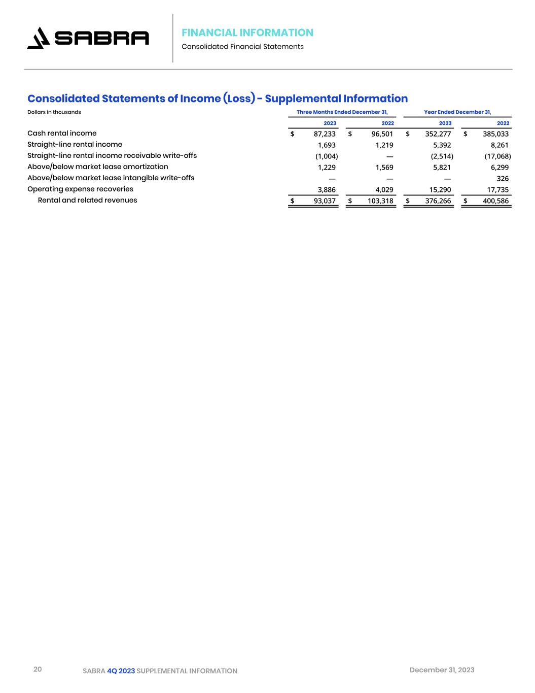 20 SABRA 4Q 2023 SUPPLEMENTAL INFORMATION December 31, 2023 FINANCIAL INFORMATION Consolidated Financial Statements Consolidated Statements of Income (Loss) - Supplemental Information Dollars in thousands Three Months Ended December 31, Year Ended December 31,   2023 2022 2023 2022 Cash rental income $ 87,233 $ 96,501 $ 352,277 $ 385,033 Straight-line rental income 1,693 1,219 5,392 8,261 Straight-line rental income receivable write-offs (1,004) — (2,514) (17,068) Above/below market lease amortization 1,229 1,569 5,821 6,299 Above/below market lease intangible write-offs — — — 326 Operating expense recoveries 3,886 4,029 15,290 17,735 Rental and related revenues $ 93,037 $ 103,318 $ 376,266 $ 400,586