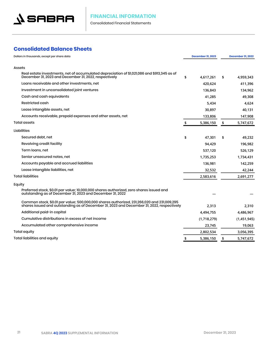 21 SABRA 4Q 2023 SUPPLEMENTAL INFORMATION December 31, 2023 FINANCIAL INFORMATION Consolidated Financial Statements Consolidated Balance Sheets Dollars in thousands, except per share data December 31, 2023 December 31, 2022   (unaudited)   Assets Real estate investments, net of accumulated depreciation of $1,021,086 and $913,345 as of December 31, 2023 and December 31, 2022, respectively $ 4,617,261 $ 4,959,343 Loans receivable and other investments, net 420,624 411,396 Investment in unconsolidated joint ventures 136,843 134,962 Cash and cash equivalents 41,285 49,308 Restricted cash 5,434 4,624 Lease intangible assets, net 30,897 40,131 Accounts receivable, prepaid expenses and other assets, net 133,806 147,908 Total assets $ 5,386,150 $ 5,747,672 Liabilities Secured debt, net $ 47,301 $ 49,232 Revolving credit facility 94,429 196,982 Term loans, net 537,120 526,129 Senior unsecured notes, net 1,735,253 1,734,431 Accounts payable and accrued liabilities 136,981 142,259 Lease intangible liabilities, net 32,532 42,244 Total liabilities 2,583,616 2,691,277 Equity Preferred stock, $0.01 par value; 10,000,000 shares authorized, zero shares issued and outstanding as of December 31, 2023 and December 31, 2022 — — Common stock, $0.01 par value; 500,000,000 shares authorized, 231,266,020 and 231,009,295 shares issued and outstanding as of December 31, 2023 and December 31, 2022, respectively 2,313 2,310 Additional paid-in capital 4,494,755 4,486,967 Cumulative distributions in excess of net income (1,718,279) (1,451,945) Accumulated other comprehensive income 23,745 19,063 Total equity 2,802,534 3,056,395 Total liabilities and equity $ 5,386,150 $ 5,747,672