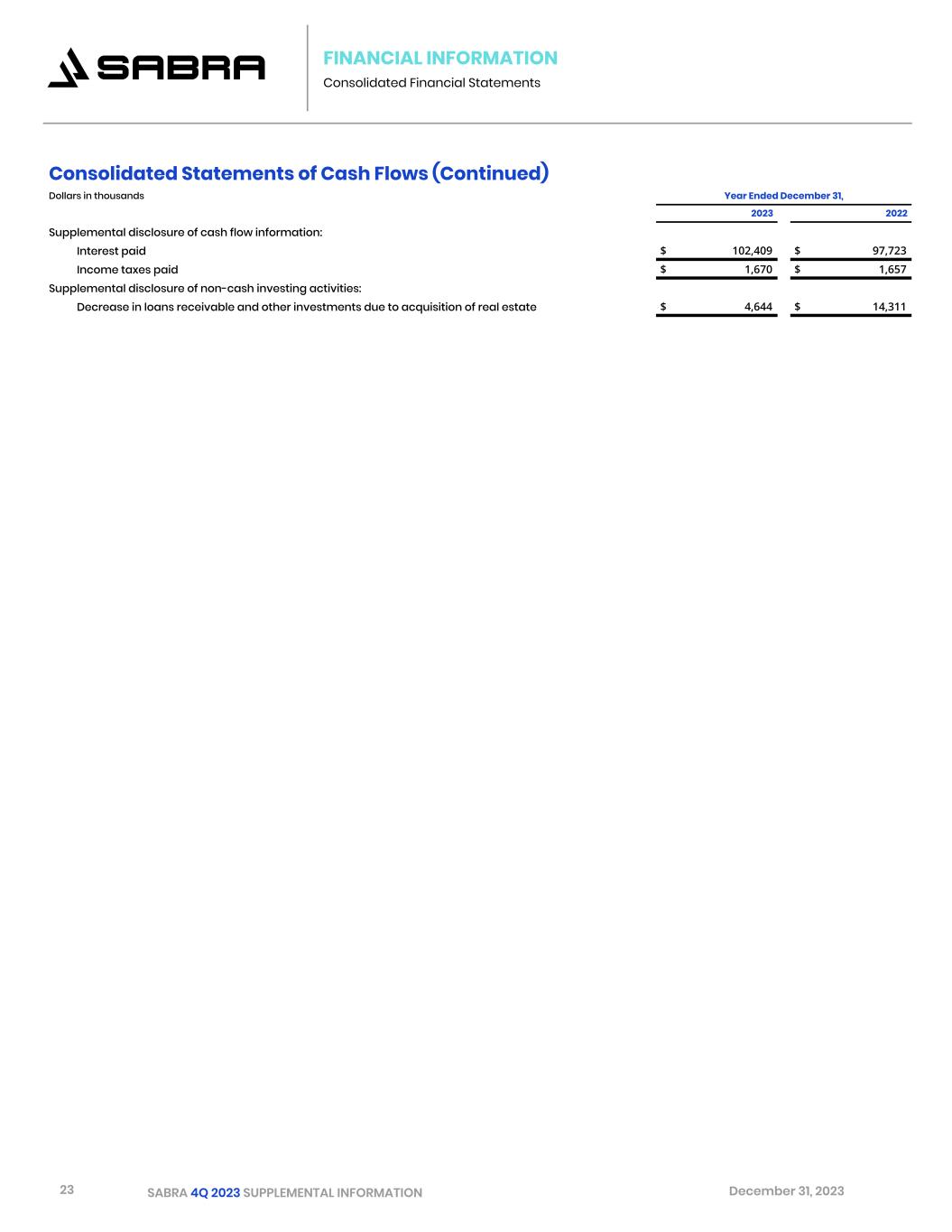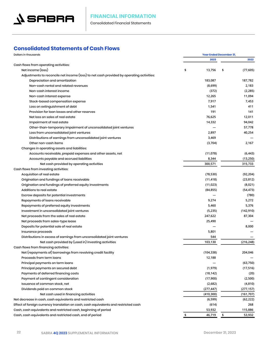 22 SABRA 4Q 2023 SUPPLEMENTAL INFORMATION December 31, 2023 FINANCIAL INFORMATION Consolidated Financial Statements Consolidated Statements of Cash Flows Dollars in thousands Year Ended December 31, 2023 2022 Cash flows from operating activities: Net income (loss) $ 13,756 $ (77,605) Adjustments to reconcile net income (loss) to net cash provided by operating activities: Depreciation and amortization 183,087 187,782 Non-cash rental and related revenues (8,699) 2,183 Non-cash interest income (372) (2,285) Non-cash interest expense 12,265 11,094 Stock-based compensation expense 7,917 7,453 Loss on extinguishment of debt 1,541 411 Provision for loan losses and other reserves 191 141 Net loss on sales of real estate 76,625 12,011 Impairment of real estate 14,332 94,042 Other-than-temporary impairment of unconsolidated joint ventures — 57,778 Loss from unconsolidated joint ventures 2,897 40,254 Distributions of earnings from unconsolidated joint ventures 3,469 — Other non-cash items (3,704) 2,167 Changes in operating assets and liabilities: Accounts receivable, prepaid expenses and other assets, net (11,078) (6,443) Accounts payable and accrued liabilities 8,344 (13,250) Net cash provided by operating activities 300,571 315,733 Cash flows from investing activities: Acquisition of real estate (78,530) (92,204) Origination and fundings of loans receivable (11,418) (23,812) Origination and fundings of preferred equity investments (11,023) (8,021) Additions to real estate (84,855) (54,473) Escrow deposits for potential investments — (780) Repayments of loans receivable 9,274 5,272 Repayments of preferred equity investments 5,460 5,376 Investment in unconsolidated joint ventures (5,235) (142,910) Net proceeds from the sales of real estate 247,622 87,304 Net proceeds from sales-type lease 25,490 — Deposits for potential sale of real estate — 8,000 Insurance proceeds 5,801 — Distributions in excess of earnings from unconsolidated joint ventures 544 — Net cash provided by (used in) investing activities 103,130 (216,248) Cash flows from financing activities: Net (repayments of) borrowings from revolving credit facility (104,338) 204,046 Proceeds from term loans 12,188 — Principal payments on term loans — (63,750) Principal payments on secured debt (1,979) (17,516) Payments of deferred financing costs (18,142) (20) Payment of contingent consideration (17,900) (2,500) Issuance of common stock, net (2,682) (4,810) Dividends paid on common stock (277,447) (277,157) Net cash used in financing activities (410,300) (161,707) Net decrease in cash, cash equivalents and restricted cash (6,599) (62,222) Effect of foreign currency translation on cash, cash equivalents and restricted cash (614) 268 Cash, cash equivalents and restricted cash, beginning of period 53,932 115,886 Cash, cash equivalents and restricted cash, end of period $ 46,719 $ 53,932