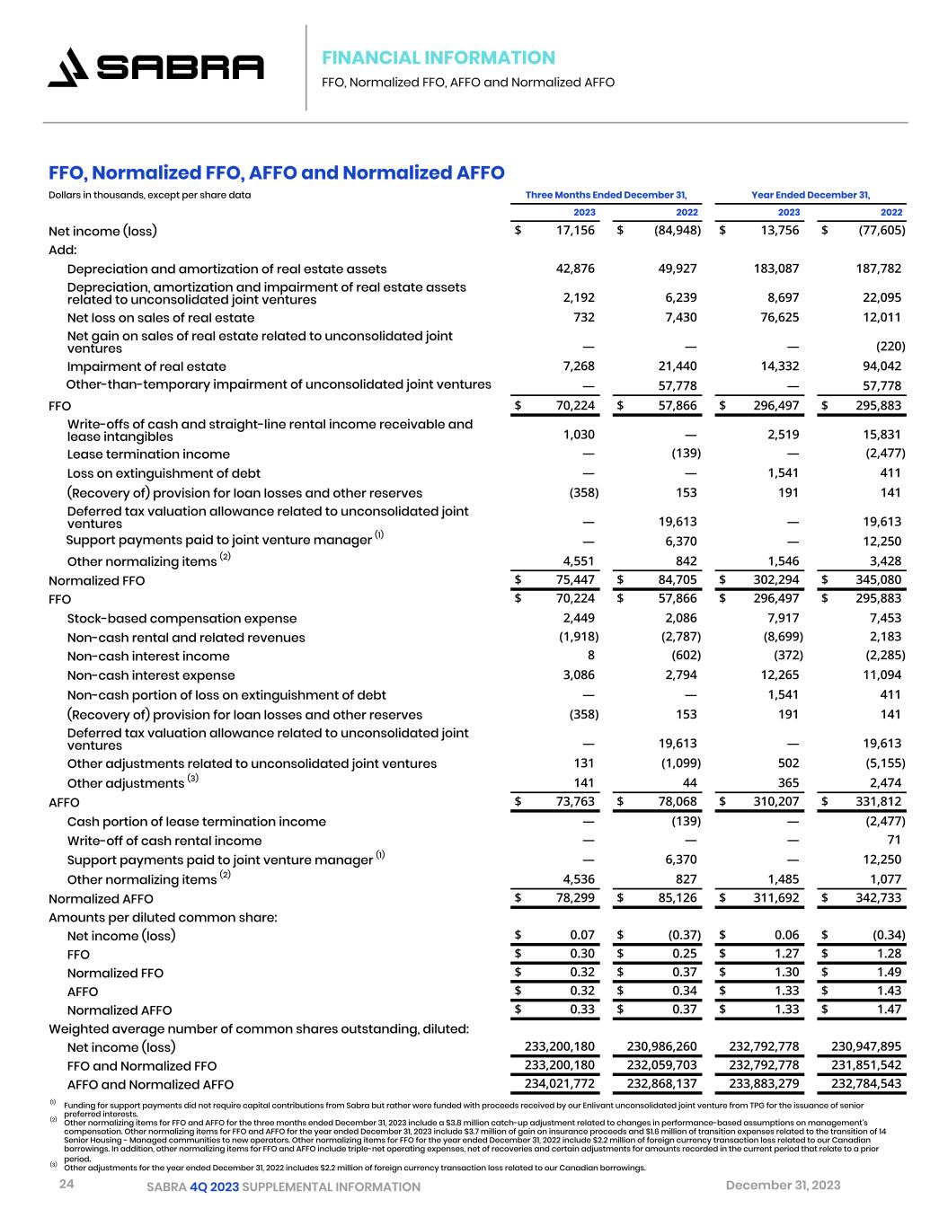 24 SABRA 4Q 2023 SUPPLEMENTAL INFORMATION December 31, 2023 FINANCIAL INFORMATION FFO, Normalized FFO, AFFO and Normalized AFFO (1) Funding for support payments did not require capital contributions from Sabra but rather were funded with proceeds received by our Enlivant unconsolidated joint venture from TPG for the issuance of senior preferred interests. (2) Other normalizing items for FFO and AFFO for the three months ended December 31, 2023 include a $3.8 million catch-up adjustment related to changes in performance-based assumptions on management's compensation. Other normalizing items for FFO and AFFO for the year ended December 31, 2023 include $3.7 million of gain on insurance proceeds and $1.6 million of transition expenses related to the transition of 14 Senior Housing - Managed communities to new operators. Other normalizing items for FFO for the year ended December 31, 2022 include $2.2 million of foreign currency transaction loss related to our Canadian borrowings. In addition, other normalizing items for FFO and AFFO include triple-net operating expenses, net of recoveries and certain adjustments for amounts recorded in the current period that relate to a prior period. (3) Other adjustments for the year ended December 31, 2022 includes $2.2 million of foreign currency transaction loss related to our Canadian borrowings. FFO, Normalized FFO, AFFO and Normalized AFFO Dollars in thousands, except per share data Three Months Ended December 31, Year Ended December 31,   2023 2022 2023 2022 Net income (loss) $ 17,156 $ (84,948) $ 13,756 $ (77,605) Add: Depreciation and amortization of real estate assets 42,876 49,927 183,087 187,782 Depreciation, amortization and impairment of real estate assets related to unconsolidated joint ventures 2,192 6,239 8,697 22,095 Net loss on sales of real estate 732 7,430 76,625 12,011 Net gain on sales of real estate related to unconsolidated joint ventures — — — (220) Impairment of real estate 7,268 21,440 14,332 94,042 Other-than-temporary impairment of unconsolidated joint ventures — 57,778 — 57,778 FFO $ 70,224 $ 57,866 $ 296,497 $ 295,883 Write-offs of cash and straight-line rental income receivable and lease intangibles 1,030 — 2,519 15,831 Lease termination income — (139) — (2,477) Loss on extinguishment of debt — — 1,541 411 (Recovery of) provision for loan losses and other reserves (358) 153 191 141 Deferred tax valuation allowance related to unconsolidated joint ventures — 19,613 — 19,613 Support payments paid to joint venture manager (1) — 6,370 — 12,250 Other normalizing items (2) 4,551 842 1,546 3,428 Normalized FFO $ 75,447 $ 84,705 $ 302,294 $ 345,080 FFO $ 70,224 $ 57,866 $ 296,497 $ 295,883 Stock-based compensation expense 2,449 2,086 7,917 7,453 Non-cash rental and related revenues (1,918) (2,787) (8,699) 2,183 Non-cash interest income 8 (602) (372) (2,285) Non-cash interest expense 3,086 2,794 12,265 11,094 Non-cash portion of loss on extinguishment of debt — — 1,541 411 (Recovery of) provision for loan losses and other reserves (358) 153 191 141 Deferred tax valuation allowance related to unconsolidated joint ventures — 19,613 — 19,613 Other adjustments related to unconsolidated joint ventures 131 (1,099) 502 (5,155) Other adjustments (3) 141 44 365 2,474 AFFO $ 73,763 $ 78,068 $ 310,207 $ 331,812 Cash portion of lease termination income — (139) — (2,477) Write-off of cash rental income — — — 71 Support payments paid to joint venture manager (1) — 6,370 — 12,250 Other normalizing items (2) 4,536 827 1,485 1,077 Normalized AFFO $ 78,299 $ 85,126 $ 311,692 $ 342,733 Amounts per diluted common share: Net income (loss) $ 0.07 $ (0.37) $ 0.06 $ (0.34) FFO $ 0.30 $ 0.25 $ 1.27 $ 1.28 Normalized FFO $ 0.32 $ 0.37 $ 1.30 $ 1.49 AFFO $ 0.32 $ 0.34 $ 1.33 $ 1.43 Normalized AFFO $ 0.33 $ 0.37 $ 1.33 $ 1.47 Weighted average number of common shares outstanding, diluted: Net income (loss) 233,200,180 230,986,260 232,792,778 230,947,895 FFO and Normalized FFO 233,200,180 232,059,703 232,792,778 231,851,542 AFFO and Normalized AFFO 234,021,772 232,868,137 233,883,279 232,784,543