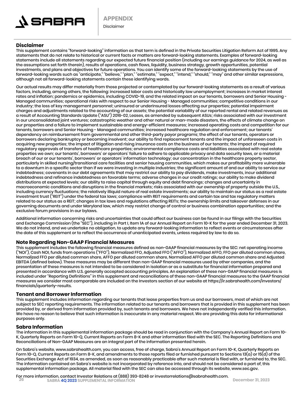 26 SABRA 4Q 2023 SUPPLEMENTAL INFORMATION December 31, 2023 APPENDIX Disclaimer Disclaimer This supplement contains “forward-looking” information as that term is defined in the Private Securities Litigation Reform Act of 1995. Any statements that do not relate to historical or current facts or matters are forward-looking statements. Examples of forward-looking statements include all statements regarding our expected future financial position (including our earnings guidance for 2024, as well as the assumptions set forth therein), results of operations, cash flows, liquidity, business strategy, growth opportunities, potential investments, and plans and objectives for future operations. You can identify some of the forward-looking statements by the use of forward-looking words such as "anticipate," "believe," "plan," "estimate," "expect," "intend," "should," "may" and other similar expressions, although not all forward-looking statements contain these identifying words. Our actual results may differ materially from those projected or contemplated by our forward-looking statements as a result of various factors, including, among others, the following: increased labor costs and historically low unemployment; increases in market interest rates and inflation; pandemics or epidemics, including COVID-19, and the related impact on our tenants, borrowers and Senior Housing - Managed communities; operational risks with respect to our Senior Housing - Managed communities; competitive conditions in our industry; the loss of key management personnel; uninsured or underinsured losses affecting our properties; potential impairment charges and adjustments related to the accounting of our assets; the potential variability of our reported rental and related revenues as a result of Accounting Standards Update (“ASU”) 2016-02, Leases, as amended by subsequent ASUs; risks associated with our investment in our unconsolidated joint ventures; catastrophic weather and other natural or man-made disasters, the effects of climate change on our properties and a failure to implement sustainable and energy-efficient measures; increased operating costs and competition for our tenants, borrowers and Senior Housing - Managed communities; increased healthcare regulation and enforcement; our tenants’ dependency on reimbursement from governmental and other third-party payor programs; the effect of our tenants, operators or borrowers declaring bankruptcy or becoming insolvent; our ability to find replacement tenants and the impact of unforeseen costs in acquiring new properties; the impact of litigation and rising insurance costs on the business of our tenants; the impact of required regulatory approvals of transfers of healthcare properties; environmental compliance costs and liabilities associated with real estate properties we own; our tenants’, borrowers' or operators’ failure to adhere to applicable privacy and data security laws, or a material breach of our or our tenants’, borrowers' or operators’ information technology; our concentration in the healthcare property sector, particularly in skilled nursing/transitional care facilities and senior housing communities, which makes our profitability more vulnerable to a downturn in a specific sector than if we were investing in multiple industries; the significant amount of and our ability to service our indebtedness; covenants in our debt agreements that may restrict our ability to pay dividends, make investments, incur additional indebtedness and refinance indebtedness on favorable terms; adverse changes in our credit ratings; our ability to make dividend distributions at expected levels; our ability to raise capital through equity and debt financings; changes and uncertainty in macroeconomic conditions and disruptions in the financial markets; risks associated with our ownership of property outside the U.S., including currency fluctuations; the relatively illiquid nature of real estate investments; our ability to maintain our status as a real estate investment trust (“REIT”) under the federal tax laws; compliance with REIT requirements and certain tax and tax regulatory matters related to our status as a REIT; changes in tax laws and regulations affecting REITs; the ownership limits and takeover defenses in our governing documents and under Maryland law, which may restrict change of control or business combination opportunities; and the exclusive forum provisions in our bylaws. Additional information concerning risks and uncertainties that could affect our business can be found in our filings with the Securities and Exchange Commission (the “SEC”), including in Part I, Item 1A of our Annual Report on Form 10-K for the year ended December 31, 2023. We do not intend, and we undertake no obligation, to update any forward-looking information to reflect events or circumstances after the date of this supplement or to reflect the occurrence of unanticipated events, unless required by law to do so. Note Regarding Non-GAAP Financial Measures This supplement includes the following financial measures defined as non-GAAP financial measures by the SEC: net operating income (“NOI”), Cash NOI, funds from operations (“FFO”), Normalized FFO, Adjusted FFO (“AFFO”), Normalized AFFO, FFO per diluted common share, Normalized FFO per diluted common share, AFFO per diluted common share, Normalized AFFO per diluted common share and Adjusted EBITDA (defined below). These measures may be different than non-GAAP financial measures used by other companies, and the presentation of these measures is not intended to be considered in isolation or as a substitute for financial information prepared and presented in accordance with U.S. generally accepted accounting principles. An explanation of these non-GAAP financial measures is included under “Reporting Definitions” in this supplement and reconciliations of these non-GAAP financial measures to the GAAP financia