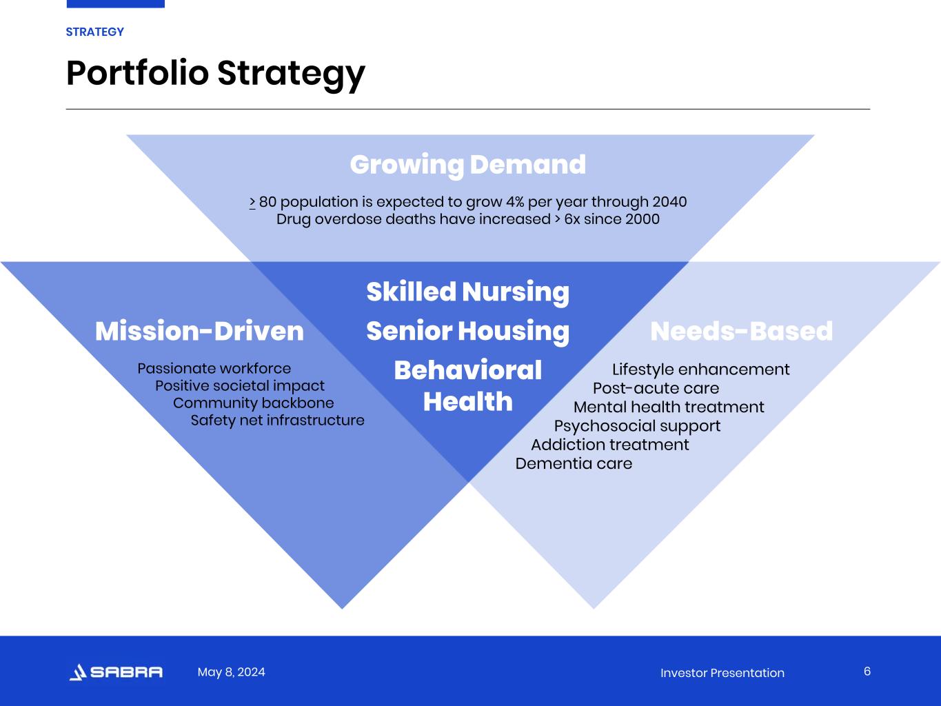 May 8, 2024 Investor Presentation 5 “We know what happens inside our buildings matters most. That’s why we align ourselves with operators who skillfully and compassionately care for the residents and patients in the buildings we own.” -Rick Matros (he/him), Chief Executive Officer STRATEGY