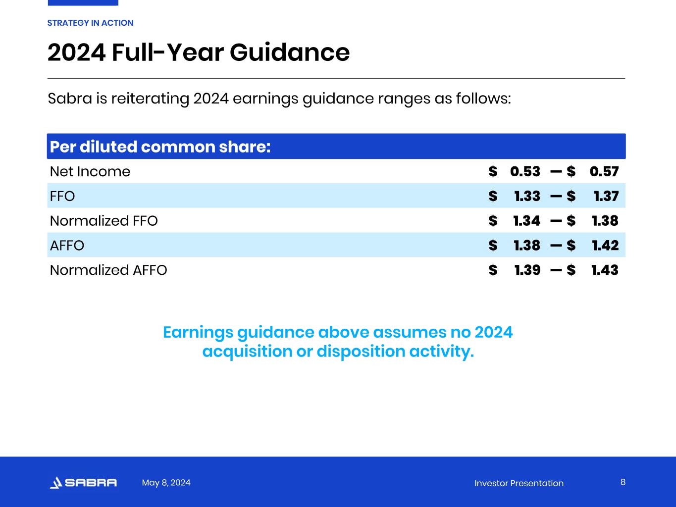 May 8, 2024 Investor Presentation 2024 Full-Year Guidance 8 STRATEGY IN ACTION Per diluted common share: Net Income $ 0.53 — $ 0.57 FFO $ 1.33 — $ 1.37 Normalized FFO $ 1.34 — $ 1.38 AFFO $ 1.38 — $ 1.42 Normalized AFFO $ 1.39 — $ 1.43 Earnings guidance above assumes no 2024 acquisition or disposition activity. Sabra is reiterating 2024 earnings guidance ranges as follows: