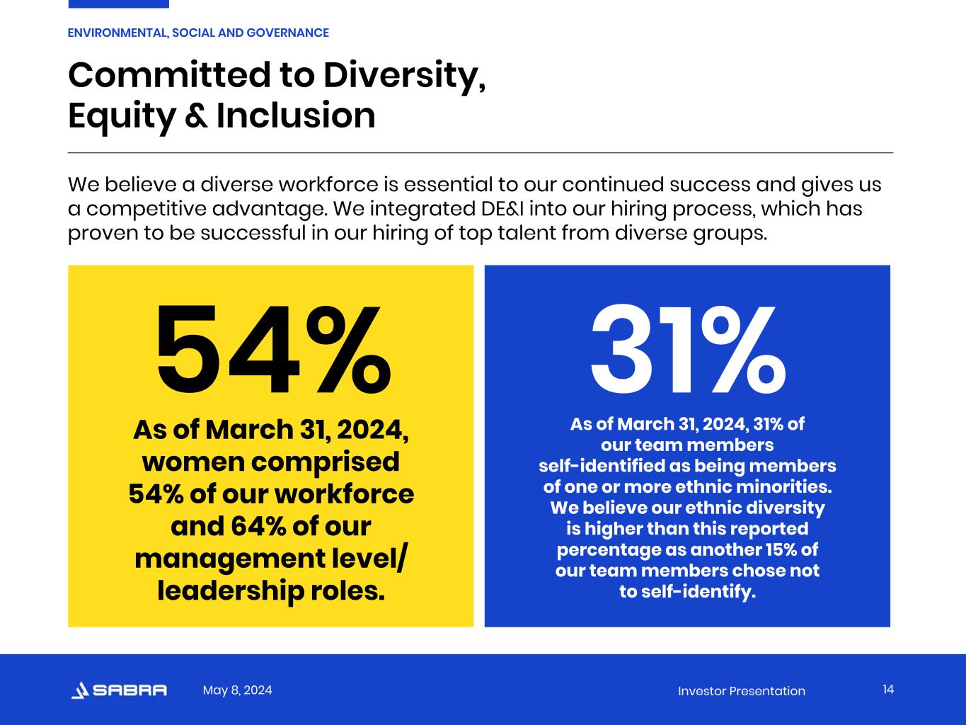 May 8, 2024 Investor Presentation Delos WISE Forum - Finding Solutions to Accelerate Change 13 ENVIRONMENTAL, SOCIAL AND GOVERNANCE As an extension of our WISE Initiative (Wellness in Senior Living Environment), Sabra helped organize and sponsor the inaugural WISE Forum bringing together like-minded REITs, along with industry leaders, to build community, discuss systemic challenges and create solutions for the future of senior living. The goal was to focus and act on not only the challenges but also the solutions and processes needed to accelerate change. The response to the forum was overwhelmingly positive.