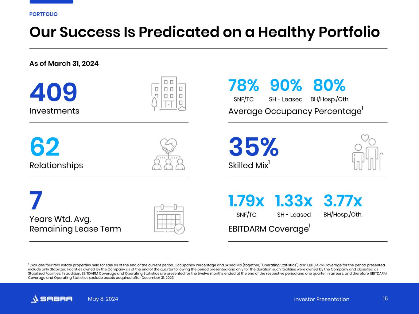 May 8, 2024 Investor Presentation Tenant and Borrower Information This presentation includes information (e.g., EBITDARM Coverage and Occupancy Percentage) regarding certain of our tenants that lease properties from us and our borrowers, most of which are not subject to SEC reporting requirements. The information related to our tenants and borrowers that is provided in this presentation has been provided by, or derived from information provided by, such tenants and borrowers. We have not independently verified this information. We have no reason to believe that such information is inaccurate in any material respect. We are providing this data for informational purposes only. Non-GAAP Financial Measures This presentation contains certain non-GAAP financial measures related to Sabra Health Care REIT, Inc., including Annualized Cash NOI, Net Debt to Adjusted EBITDA and funds from operations (FFO). These measures may be different than non-GAAP financial measures used by other companies, and the presentation of these measures is not intended to be considered in isolation or as a substitute for financial information prepared and presented in accordance with U.S. generally accepted accounting principles (GAAP). An explanation of these non-GAAP financial measures is included under “Definitions” in the Appendix, and reconciliations of these non-GAAP financial measures to the GAAP financial measures we consider most comparable are included on the Investors section of our website at https://ir.sabrahealth.com/investors/financials/quarterly-results. Disclaimers 3