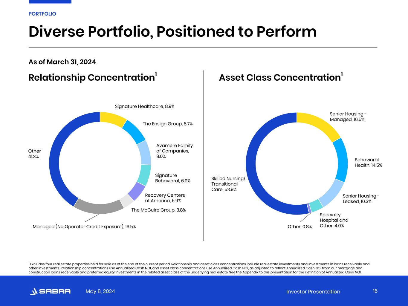 May 8, 2024 Investor Presentation Our Success Is Predicated on a Healthy Portfolio 1 Excludes four real estate properties held for sale as of the end of the current period. Occupancy Percentage and Skilled Mix (together, “Operating Statistics”) and EBITDARM Coverage for the period presented include only Stabilized Facilities owned by the Company as of the end of the quarter following the period presented and only for the duration such facilities were owned by the Company and classified as Stabilized Facilities. In addition, EBITDARM Coverage and Operating Statistics are presented for the twelve months ended at the end of the respective period and one quarter in arrears, and therefore, EBITDARM Coverage and Operating Statistics exclude assets acquired after December 31, 2023. 7 Years Wtd. Avg. Remaining Lease Term 409 Investments 1.79x   1.33x   3.77x 62 Relationships 35% Skilled Mix1 Average Occupancy Percentage1 78%   90%   80% SH - LeasedSNF/TC SNF/TC SH - Leased EBITDARM Coverage1 As of March 31, 2024 BH/Hosp./Oth. BH/Hosp./Oth. 15 PORTFOLIO