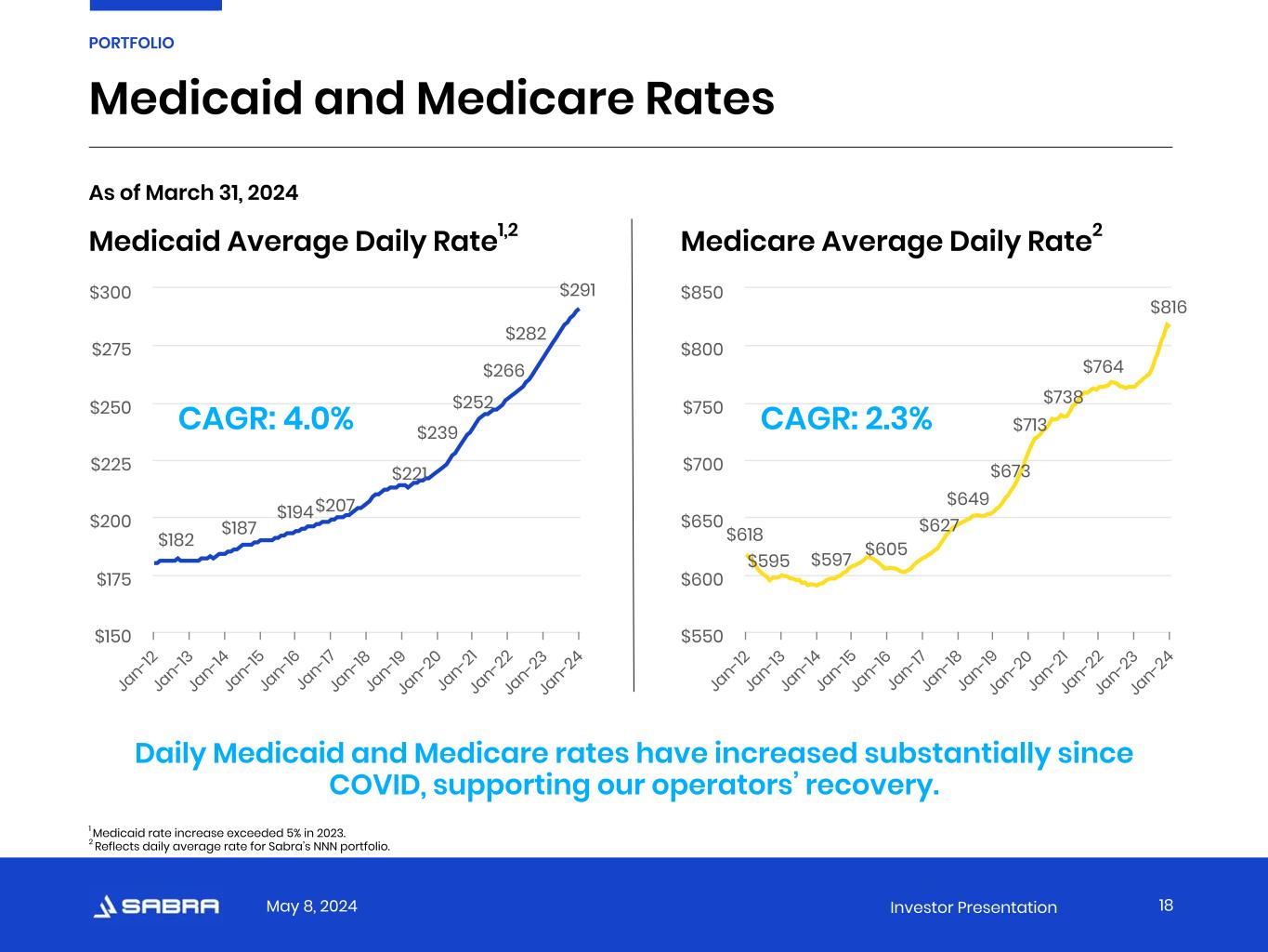 May 8, 2024 Investor Presentation Favorable Supply and Demand Trends 17 PORTFOLIO SNF Supply and Demand 1,780 1,757 1,725 1,712 1,706 1,703 1,697 1,695 1,693 1,675 1,628 1,594 4,399 4,641 4,946 5,296 5,600 5,880 6,055 6,304 6,468 6,590 6,467 6,677 SNF Beds (000s) Population 85 or older (000s) 2000 2001 2002 2003 2004 2005 2006 2007 2008 2009 2010 2011 2012 2013 2014 2015 2016 2017 2018 2019 2020 2021 2022 2023 — 1,000 2,000 3,000 4,000 5,000 6,000 7,000 8,000 Source: Census.gov, AHCA, Care Compare Since 2000, the 85-or-older population has grown by 55%, compared to an 11% decline in skilled nursing beds over the same time frame.