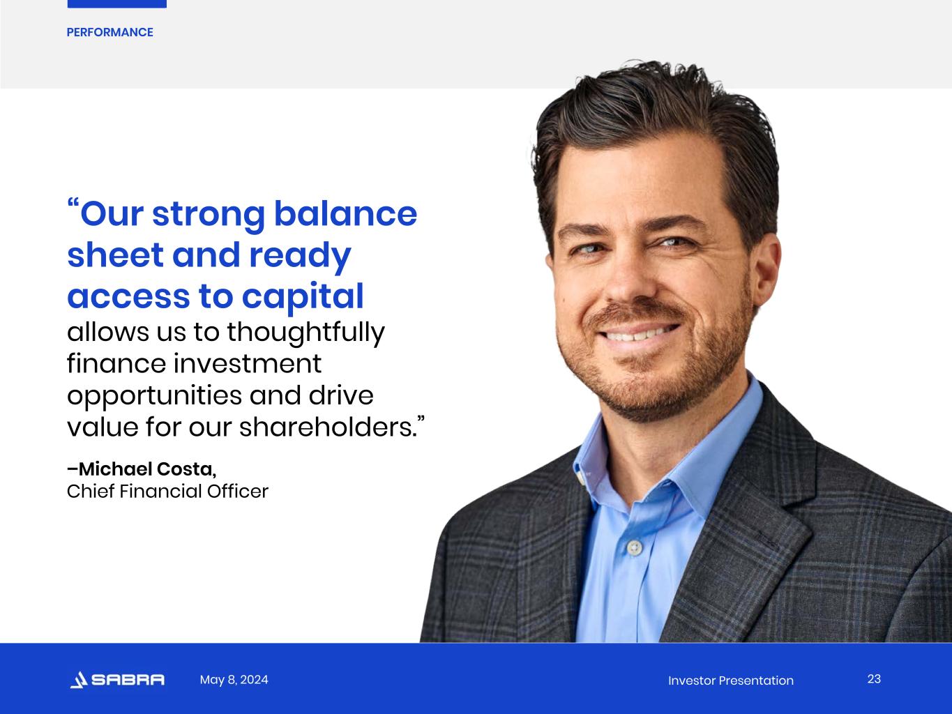 May 8, 2024 Investor Presentation “Our strong balance sheet and ready access to capital allows us to thoughtfully finance investment opportunities and drive value for our shareholders.” –Michael Costa, Chief Financial Officer 23 PERFORMANCE