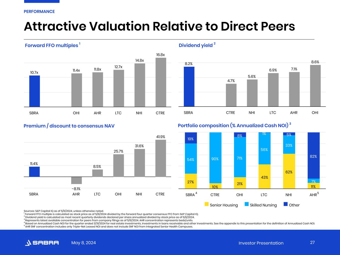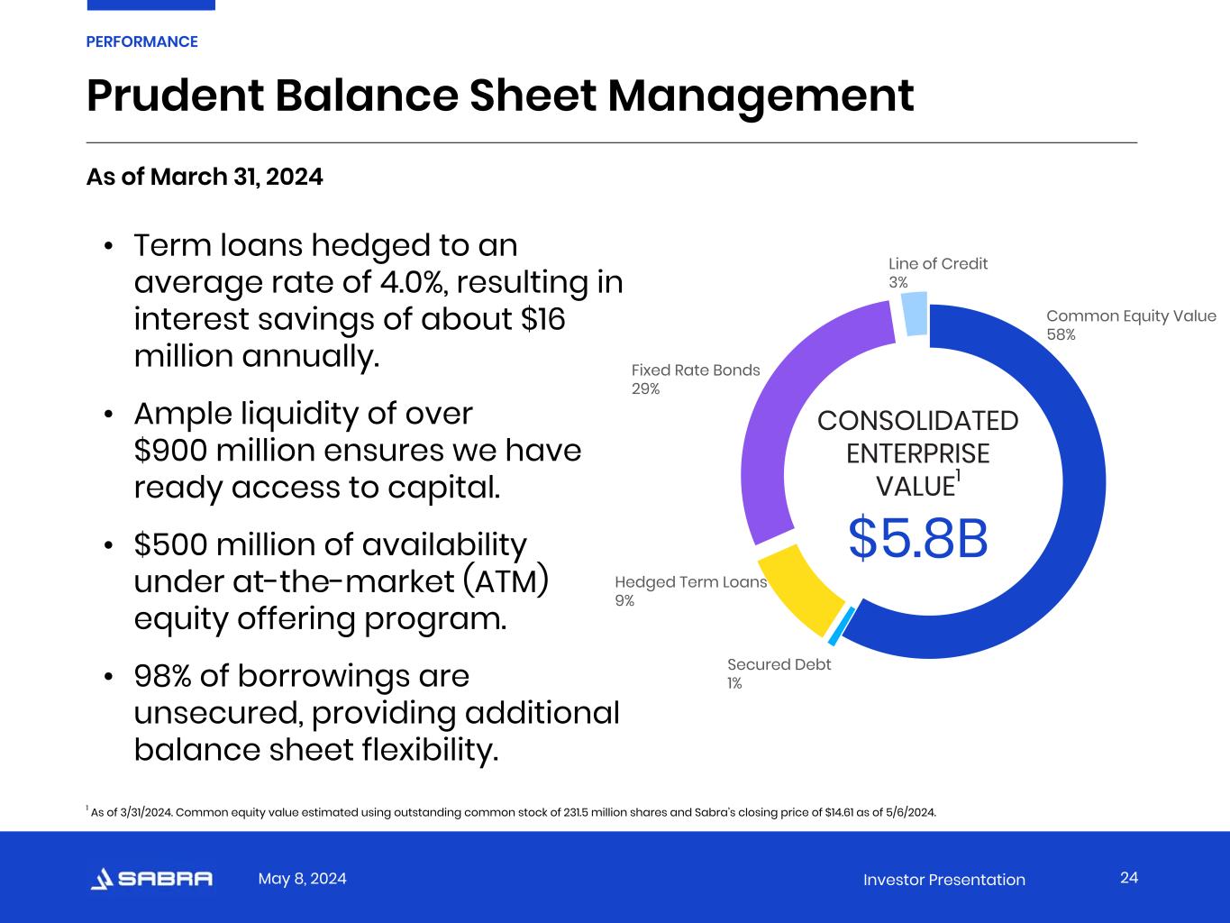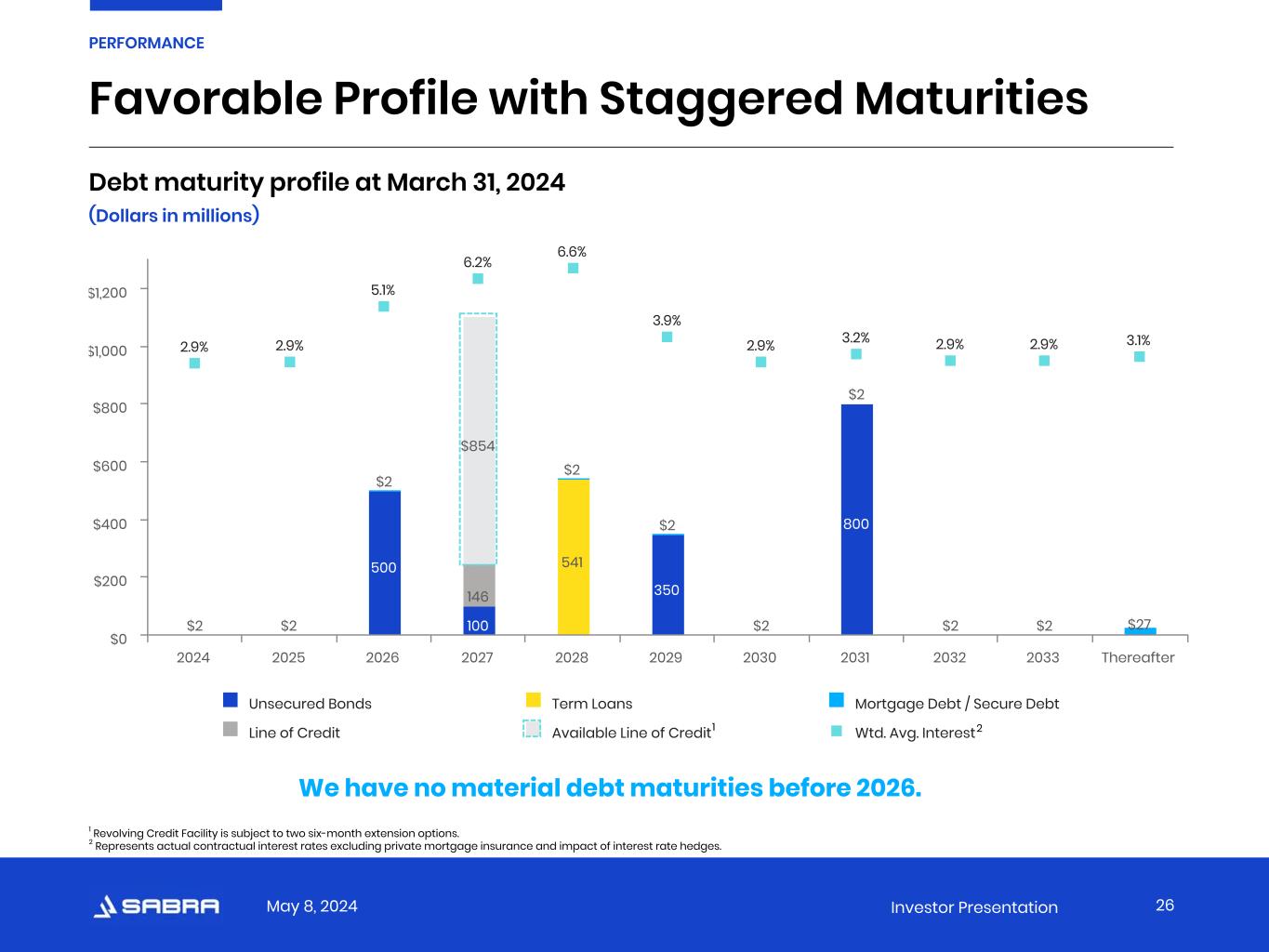 May 8, 2024 Investor Presentation   Sabra 1Q 24 1 Investment-Grade peers range 2 Net Debt to Adjusted EBITDA 5.55x 3 4.37x - 6.86x Interest Coverage Ratio 4.06x 3.80x - 4.82x Debt as a % of Asset Value 37% 26% - 48% Secured Debt as a % of Asset Value 1% 0% - 9% Investment-Grade Credit Metrics 1 Key credit statistics (except Net Debt to Adjusted EBITDA) are calculated in accordance with the credit agreement relating to the revolving credit facility and the indentures relating to our senior unsecured notes. In addition, key credit statistics give effect to dispositions and acquisitions completed after the period presented as though such dispositions and acquisitions occurred at the beginning of the period. 2 Investment-Grade Peers consists of WELL, VTR, OHI and NHI. The metrics used to calculate Investment-Grade peers range are sourced from the most recent public filings with the SEC and may not be calculated in a manner identical to Sabra’s metrics. 3 Based on the annualized trailing three-month period ended as of the date indicated. 25 PERFORMANCE We continue to focus on strengthening our balance sheet and portfolio without accessing the capital markets.