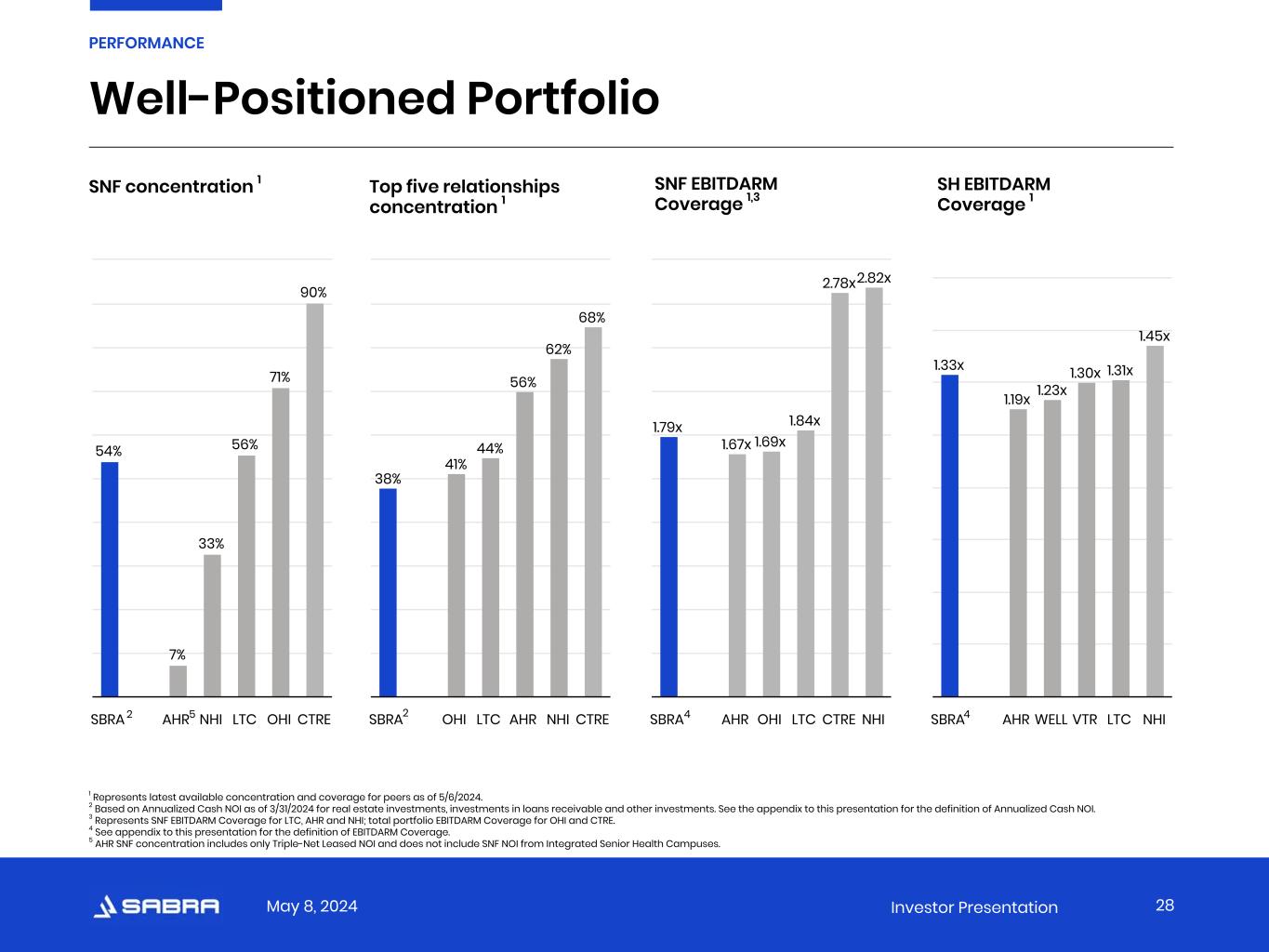 May 8, 2024 Investor Presentation Attractive Valuation Relative to Direct Peers Forward FFO multiples 1 Dividend yield 2 Premium / discount to consensus NAV Portfolio composition (% Annualized Cash NOI) 3 Sources: S&P Capital IQ as of 5/6/2024, unless otherwise noted. 1 Forward FFO multiple is calculated as stock price as of 5/6/2024 divided by the forward four quarter consensus FFO from S&P Capital IQ. 2 Dividend yield is calculated as most recent quarterly dividends declared per share annualized divided by stock price as of 5/6/2024. 3 Represents latest available concentration for peers from company filings as of 5/6/2024. AHR concentration represents beds/units. 4 Based on Annualized Cash NOI for the quarter ended 3/31/2024 for real estate investments, investments in loans receivable and other investments. See the appendix to this presentation for the definition of Annualized Cash NOI. 5 AHR SNF concentration includes only Triple-Net Leased NOI and does not include SNF NOI from Integrated Senior Health Campuses. 27 PERFORMANCE 10.7x 11.4x 11.8x 12.7x 14.8x 16.8x SBRA OHI AHR LTC NHI CTRE 8.2% 4.7% 5.6% 6.9% 7.1% 8.6% SBRA CTRE NHI LTC AHR OHI 11.4% -8.1% 8.5% 25.7% 31.6% 41.9% SBRA AHR LTC OHI NHI CTRE 27% 10% 21% 43% 62% 11% 54% 90% 71% 56% 33% 7% 19% 8% 1% 5% 82% Senior Housing Skilled Nursing Other SBRA CTRE OHI LTC NHI AHR4 5