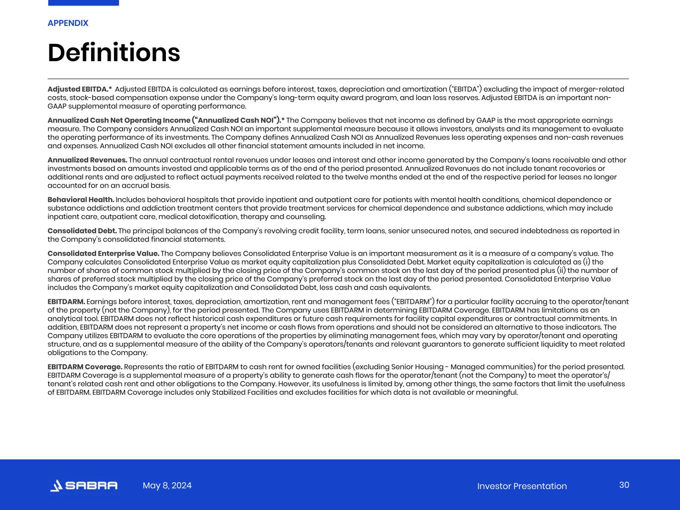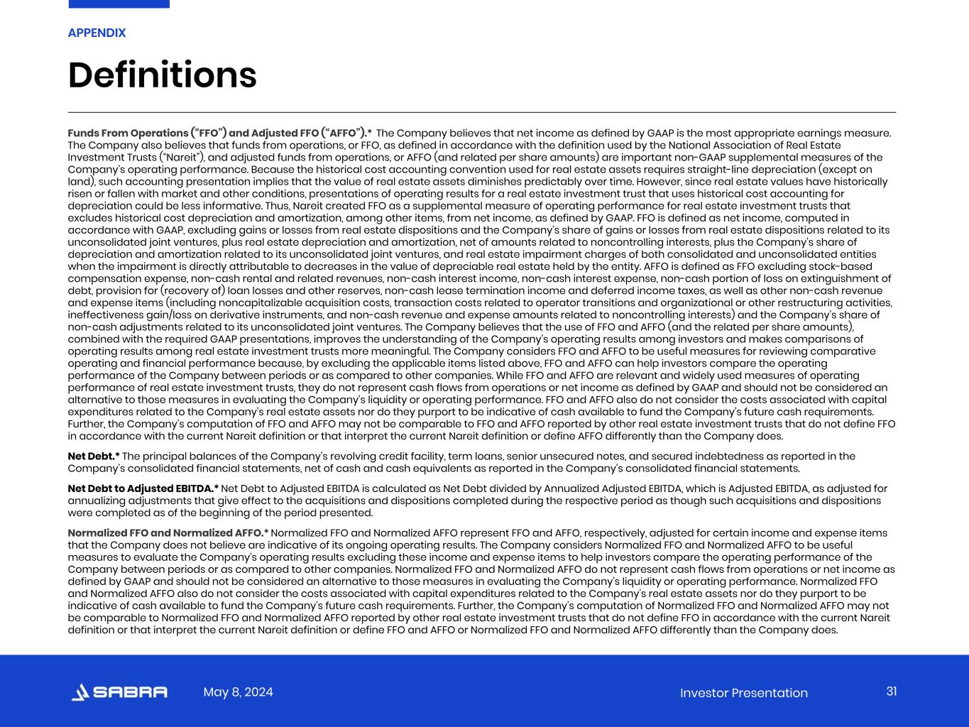 May 8, 2024 Investor Presentation Funds From Operations (“FFO”) and Adjusted FFO (“AFFO”).*  The Company believes that net income as defined by GAAP is the most appropriate earnings measure. The Company also believes that funds from operations, or FFO, as defined in accordance with the definition used by the National Association of Real Estate Investment Trusts (“Nareit”), and adjusted funds from operations, or AFFO (and related per share amounts) are important non-GAAP supplemental measures of the Company’s operating performance. Because the historical cost accounting convention used for real estate assets requires straight-line depreciation (except on land), such accounting presentation implies that the value of real estate assets diminishes predictably over time. However, since real estate values have historically risen or fallen with market and other conditions, presentations of operating results for a real estate investment trust that uses historical cost accounting for depreciation could be less informative. Thus, Nareit created FFO as a supplemental measure of operating performance for real estate investment trusts that excludes historical cost depreciation and amortization, among other items, from net income, as defined by GAAP. FFO is defined as net income, computed in accordance with GAAP, excluding gains or losses from real estate dispositions and the Company’s share of gains or losses from real estate dispositions related to its unconsolidated joint ventures, plus real estate depreciation and amortization, net of amounts related to noncontrolling interests, plus the Company’s share of depreciation and amortization related to its unconsolidated joint ventures, and real estate impairment charges of both consolidated and unconsolidated entities when the impairment is directly attributable to decreases in the value of depreciable real estate held by the entity. AFFO is defined as FFO excluding stock-based compensation expense, non-cash rental and related revenues, non-cash interest income, non-cash interest expense, non-cash portion of loss on extinguishment of debt, provision for (recovery of) loan losses and other reserves, non-cash lease termination income and deferred income taxes, as well as other non-cash revenue and expense items (including noncapitalizable acquisition costs, transaction costs related to operator transitions and organizational or other restructuring activities, ineffectiveness gain/loss on derivative instruments, and non-cash revenue and expense amounts related to noncontrolling interests) and the Company’s share of non-cash adjustments related to its unconsolidated joint ventures. The Company believes that the use of FFO and AFFO (and the related per share amounts), combined with the required GAAP presentations, improves the understanding of the Company’s operating results among investors and makes comparisons of operating results among real estate investment trusts more meaningful. The Company considers FFO and AFFO to be useful measures for reviewing comparative operating and financial performance because, by excluding the applicable items listed above, FFO and AFFO can help investors compare the operating performance of the Company between periods or as compared to other companies. While FFO and AFFO are relevant and widely used measures of operating performance of real estate investment trusts, they do not represent cash flows from operations or net income as defined by GAAP and should not be considered an alternative to those measures in evaluating the Company’s liquidity or operating performance. FFO and AFFO also do not consider the costs associated with capital expenditures related to the Company’s real estate assets nor do they purport to be indicative of cash available to fund the Company’s future cash requirements. Further, the Company’s computation of FFO and AFFO may not be comparable to FFO and AFFO reported by other real estate investment trusts that do not define FFO in accordance with the current Nareit definition or that interpret the current Nareit definition or define AFFO differently than the Company does. Net Debt.* The principal balances of the Company’s revolving credit facility, term loans, senior unsecured notes, and secured indebtedness as reported in the Company’s consolidated financial statements, net of cash and cash equivalents as reported in the Company’s consolidated financial statements. Net Debt to Adjusted EBITDA.* Net Debt to Adjusted EBITDA is calculated as Net Debt divided by Annualized Adjusted EBITDA, which is Adjusted EBITDA, as adjusted for annualizing adjustments that give effect to the acquisitions and dispositions completed during the respective period as though such acquisitions and dispositions were completed as of the beginning of the period presented. Normalized FFO and Normalized AFFO.* Normalized FFO and Normalized AFFO represent FFO and AFFO, respectively, adjusted for certain income and expense items that the Company does not believe are indicative of its ongoing operating results. The Company considers Normalized FFO and Normalized AFFO to be useful measures to evaluate the Company’s operating results excluding these income and expense items to help investors compare the operating performance of the Company between periods or as compared to other companies. Normalized FFO and Normalized AFFO do not represent cash flows from operations or net income as defined by GAAP and should not be considered an alternative to those measures in evaluating the Company’s liquidity or operating performance. Normalized FFO and Normalized AFFO also do not consider the costs associated with capital expenditures related to the Company’s real estate assets nor do they purport to be indicative of cash available to fund the Company’s future cash requirements. Further, the Company’s computation of Normalized FFO and Normalized AFFO may not be comparable to Normalized FFO and Nor
