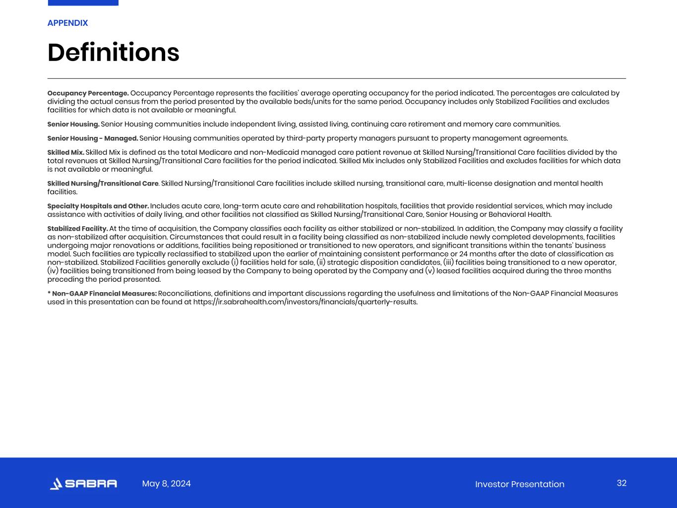May 8, 2024 Investor Presentation Occupancy Percentage. Occupancy Percentage represents the facilities’ average operating occupancy for the period indicated. The percentages are calculated by dividing the actual census from the period presented by the available beds/units for the same period. Occupancy includes only Stabilized Facilities and excludes facilities for which data is not available or meaningful. Senior Housing. Senior Housing communities include independent living, assisted living, continuing care retirement and memory care communities. Senior Housing - Managed. Senior Housing communities operated by third-party property managers pursuant to property management agreements. Skilled Mix. Skilled Mix is defined as the total Medicare and non-Medicaid managed care patient revenue at Skilled Nursing/Transitional Care facilities divided by the total revenues at Skilled Nursing/Transitional Care facilities for the period indicated. Skilled Mix includes only Stabilized Facilities and excludes facilities for which data is not available or meaningful. Skilled Nursing/Transitional Care. Skilled Nursing/Transitional Care facilities include skilled nursing, transitional care, multi-license designation and mental health facilities. Specialty Hospitals and Other. Includes acute care, long-term acute care and rehabilitation hospitals, facilities that provide residential services, which may include assistance with activities of daily living, and other facilities not classified as Skilled Nursing/Transitional Care, Senior Housing or Behavioral Health. Stabilized Facility. At the time of acquisition, the Company classifies each facility as either stabilized or non-stabilized. In addition, the Company may classify a facility as non-stabilized after acquisition. Circumstances that could result in a facility being classified as non-stabilized include newly completed developments, facilities undergoing major renovations or additions, facilities being repositioned or transitioned to new operators, and significant transitions within the tenants’ business model. Such facilities are typically reclassified to stabilized upon the earlier of maintaining consistent performance or 24 months after the date of classification as non-stabilized. Stabilized Facilities generally exclude (i) facilities held for sale, (ii) strategic disposition candidates, (iii) facilities being transitioned to a new operator, (iv) facilities being transitioned from being leased by the Company to being operated by the Company and (v) leased facilities acquired during the three months preceding the period presented. * Non-GAAP Financial Measures: Reconciliations, definitions and important discussions regarding the usefulness and limitations of the Non-GAAP Financial Measures used in this presentation can be found at https://ir.sabrahealth.com/investors/financials/quarterly-results. APPENDIX Definitions 32