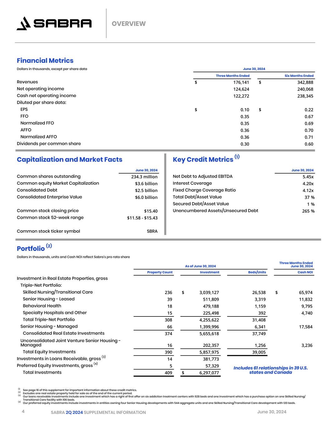 2 SABRA 2Q 2024 SUPPLEMENTAL INFORMATION June 30, 2024 03 COMPANY INFORMATION 04 OVERVIEW 05 PORTFOLIO Triple-Net Portfolio Senior Housing - Managed Portfolio Loans and Other Investments NOI Concentrations Geographic Concentrations - Consolidated Portfolio Triple-Net Lease Expirations 12 INVESTMENTS Summary 13 CAPITALIZATION Overview Indebtedness Debt Maturity Credit Metrics and Ratings 17 FINANCIAL INFORMATION 2024 Outlook Consolidated Financial Statements - Statements of Income Consolidated Financial Statements - Balance Sheets Consolidated Financial Statements - Statements of Cash Flows FFO, Normalized FFO, AFFO and Normalized AFFO Components of Net Asset Value (NAV) 24 APPENDIX Disclaimer Reporting Definitions Discussion and Reconciliation of Certain Non-GAAP Financial Measures: CONTENT https://ir.sabrahealth.com/investors/financials/quarterly-results