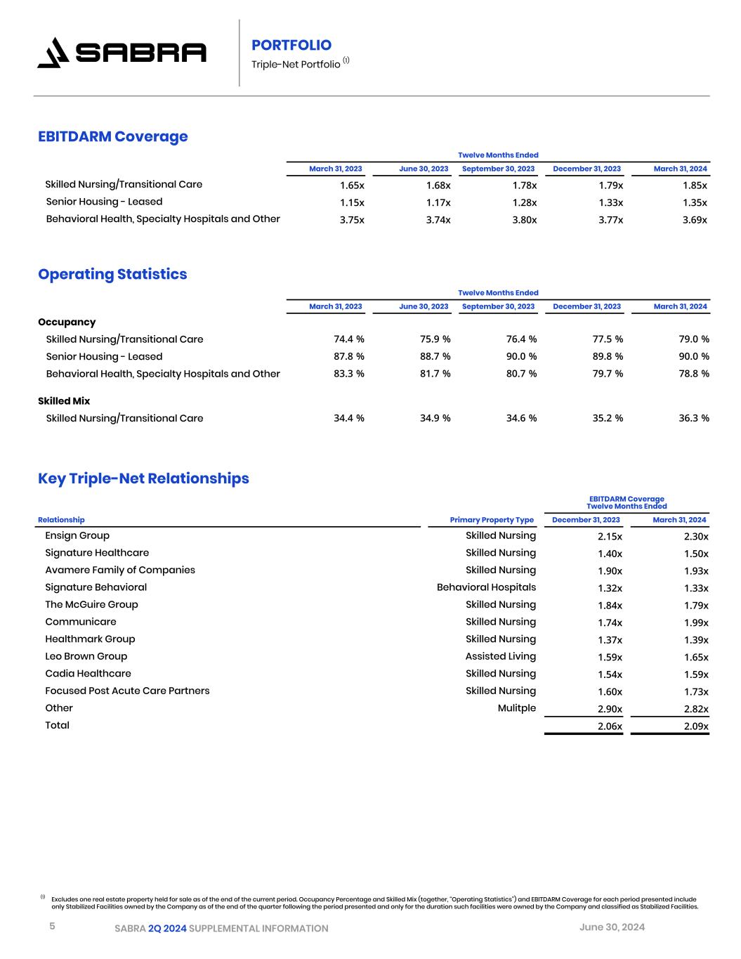 4 SABRA 2Q 2024 SUPPLEMENTAL INFORMATION June 30, 2024 Financial Metrics Dollars in thousands, except per share data June 30, 2024 Three Months Ended Six Months Ended Revenues $ 176,141 $ 342,888 Net operating income 124,624 240,068 Cash net operating income 122,272 238,345 Diluted per share data: EPS $ 0.10 $ 0.22 FFO 0.35 0.67 Normalized FFO 0.35 0.69 AFFO 0.36 0.70 Normalized AFFO 0.36 0.71 Dividends per common share 0.30 0.60 Capitalization and Market Facts Key Credit Metrics (1) June 30, 2024 June 30, 2024 Common shares outstanding 234.3 million Net Debt to Adjusted EBITDA 5.45x Common equity Market Capitalization $3.6 billion Interest Coverage 4.20x Consolidated Debt $2.5 billion Fixed Charge Coverage Ratio 4.12x Consolidated Enterprise Value $6.0 billion Total Debt/Asset Value 37 % Secured Debt/Asset Value 1 % Common stock closing price $15.40 Unencumbered Assets/Unsecured Debt 265 % Common stock 52-week range $11.58 - $15.43 Common stock ticker symbol SBRA Portfolio (2) Dollars in thousands, units and Cash NOI reflect Sabra's pro rata share Three Months Ended June 30, 2024As of June 30, 2024 Property Count Investment Beds/Units Cash NOI Investment in Real Estate Properties, gross Triple-Net Portfolio: Skilled Nursing/Transitional Care 236 $ 3,039,127 26,538 $ 65,974 Senior Housing - Leased 39 511,809 3,319 11,832 Behavioral Health 18 479,188 1,159 9,795 Specialty Hospitals and Other 15 225,498 392 4,740 Total Triple-Net Portfolio 308 4,255,622 31,408 Senior Housing - Managed 66 1,399,996 6,341 17,584 Consolidated Real Estate Investments 374 5,655,618 37,749 Unconsolidated Joint Venture Senior Housing - Managed 16 202,357 1,256 3,236 Total Equity Investments 390 5,857,975 39,005 Investments in Loans Receivable, gross (3) 14 381,773 Preferred Equity Investments, gross (4) 5 57,329 Includes 61 relationships in 39 U.S. states and CanadaTotal Investments 409 $ 6,297,077 (1) See page 16 of this supplement for important information about these credit metrics. (2) Excludes one real estate property held for sale as of the end of the current period. (3) Our loans receivable investments include one investment which has a right of first offer on six addiction treatment centers with 928 beds and one investment which has a purchase option on one Skilled Nursing/ Transitional Care facility with 106 beds. (4) Our preferred equity investments include investments in entities owning four Senior Housing developments with 544 aggregate units and one Skilled Nursing/Transitional Care development with 120 beds. OVERVIEW