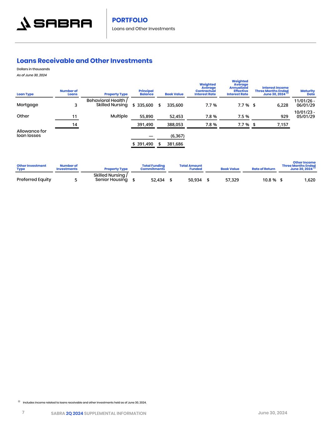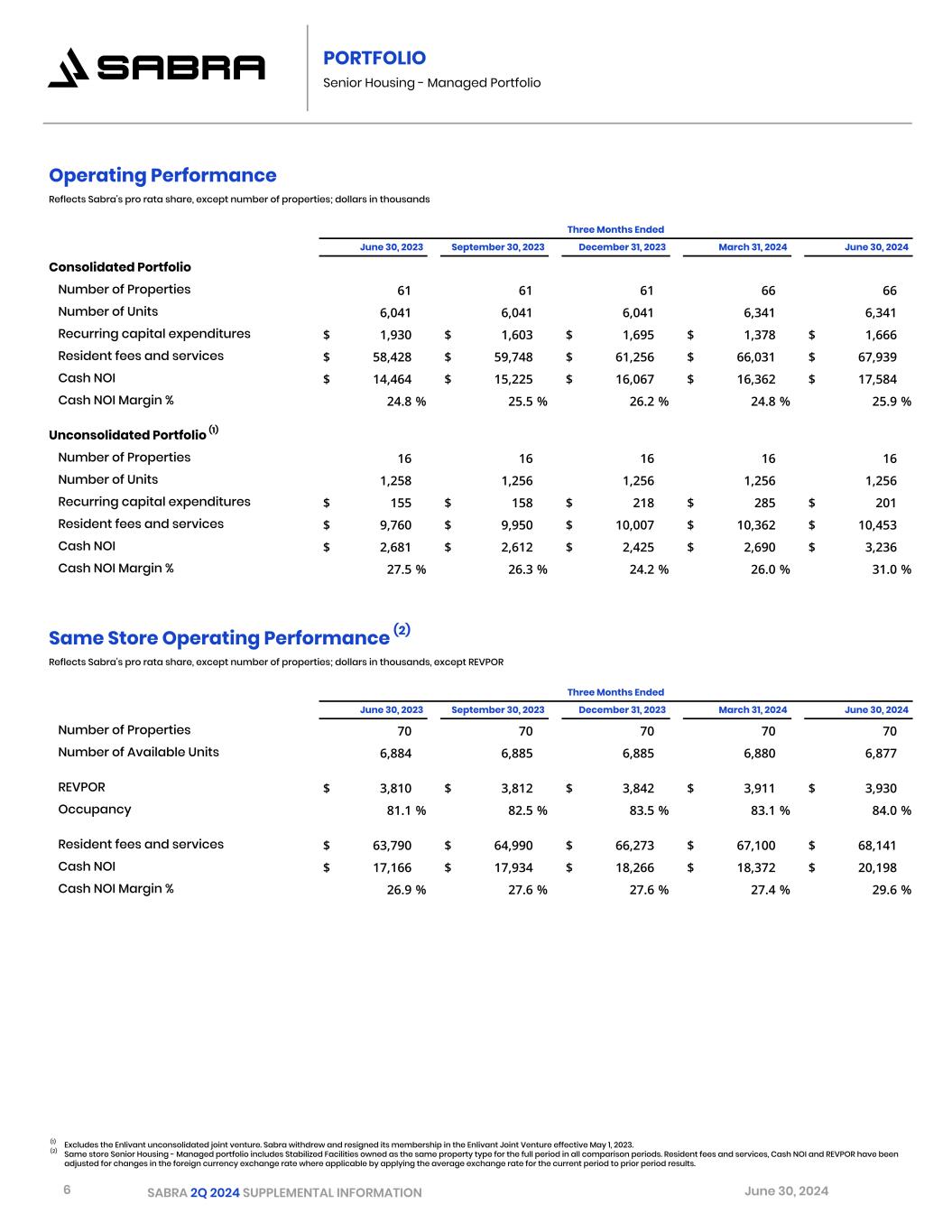 6 SABRA 2Q 2024 SUPPLEMENTAL INFORMATION June 30, 2024 PORTFOLIO Senior Housing - Managed Portfolio (1) Excludes the Enlivant unconsolidated joint venture. Sabra withdrew and resigned its membership in the Enlivant Joint Venture effective May 1, 2023. (2) Same store Senior Housing - Managed portfolio includes Stabilized Facilities owned as the same property type for the full period in all comparison periods. Resident fees and services, Cash NOI and REVPOR have been adjusted for changes in the foreign currency exchange rate where applicable by applying the average exchange rate for the current period to prior period results. Operating Performance Reflects Sabra's pro rata share, except number of properties; dollars in thousands Three Months Ended June 30, 2023 September 30, 2023 December 31, 2023 March 31, 2024 June 30, 2024 Consolidated Portfolio Number of Properties 61 61 61 66 66 Number of Units 6,041 6,041 6,041 6,341 6,341 Recurring capital expenditures $ 1,930 $ 1,603 $ 1,695 $ 1,378 $ 1,666 Resident fees and services $ 58,428 $ 59,748 $ 61,256 $ 66,031 $ 67,939 Cash NOI $ 14,464 $ 15,225 $ 16,067 $ 16,362 $ 17,584 Cash NOI Margin % 24.8 % 25.5 % 26.2 % 24.8 % 25.9 % Unconsolidated Portfolio (1) Number of Properties 16 16 16 16 16 Number of Units 1,258 1,256 1,256 1,256 1,256 Recurring capital expenditures $ 155 $ 158 $ 218 $ 285 $ 201 Resident fees and services $ 9,760 $ 9,950 $ 10,007 $ 10,362 $ 10,453 Cash NOI $ 2,681 $ 2,612 $ 2,425 $ 2,690 $ 3,236 Cash NOI Margin % 27.5 % 26.3 % 24.2 % 26.0 % 31.0 % Same Store Operating Performance (2) Reflects Sabra's pro rata share, except number of properties; dollars in thousands, except REVPOR Three Months Ended June 30, 2023 September 30, 2023 December 31, 2023 March 31, 2024 June 30, 2024 Number of Properties 70 70 70 70 70 Number of Available Units 6,884 6,885 6,885 6,880 6,877 REVPOR $ 3,810 $ 3,812 $ 3,842 $ 3,911 $ 3,930 Occupancy 81.1 % 82.5 % 83.5 % 83.1 % 84.0 % Resident fees and services $ 63,790 $ 64,990 $ 66,273 $ 67,100 $ 68,141 Cash NOI $ 17,166 $ 17,934 $ 18,266 $ 18,372 $ 20,198 Cash NOI Margin % 26.9 % 27.6 % 27.6 % 27.4 % 29.6 %