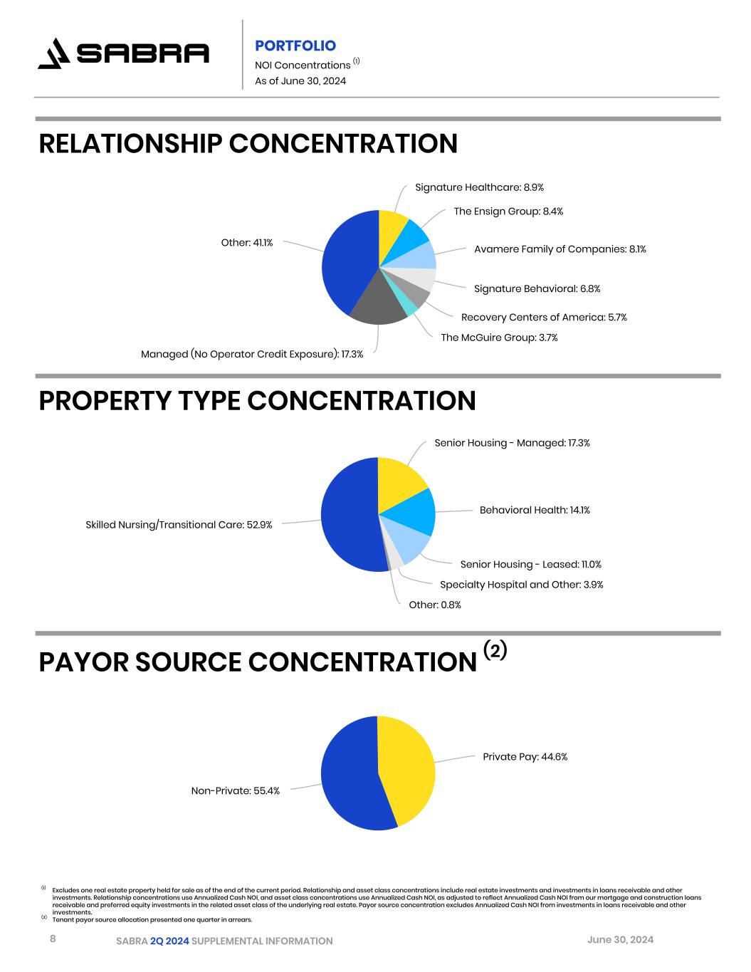 7 SABRA 2Q 2024 SUPPLEMENTAL INFORMATION June 30, 2024 PORTFOLIO Loans and Other Investments Loans Receivable and Other Investments Dollars in thousands As of June 30, 2024 Loan Type Number of Loans Property Type Principal Balance Book Value Weighted Average Contractual Interest Rate Weighted Average Annualized Effective Interest Rate Interest Income Three Months Ended June 30, 2024 (1) Maturity Date Mortgage 3 Behavioral Health / Skilled Nursing $ 335,600 $ 335,600 7.7 % 7.7 % $ 6,228 11/01/26 - 06/01/29 Other 11 Multiple 55,890 52,453 7.8 % 7.5 % 929 10/01/23 - 05/01/29 14 391,490 388,053 7.8 % 7.7 % $ 7,157 Allowance for loan losses — (6,367) $ 391,490 $ 381,686 Other Investment Type Number of Investments Property Type Total Funding Commitments Total Amount Funded Book Value Rate of Return Other Income Three Months Ended June 30, 2024 (1) Preferred Equity 5 Skilled Nursing / Senior Housing $ 52,434 $ 50,934 $ 57,329 10.8 % $ 1,620 (1) Includes income related to loans receivable and other investments held as of June 30, 2024.