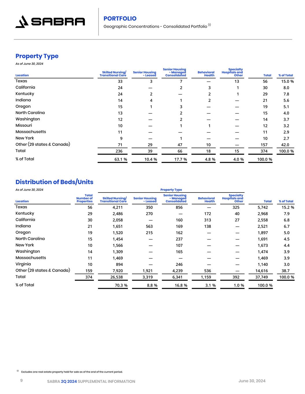 9 SABRA 2Q 2024 SUPPLEMENTAL INFORMATION June 30, 2024 PORTFOLIO Geographic Concentrations - Consolidated Portfolio (1) Property Type As of June 30, 2024 Location Skilled Nursing/ Transitional Care Senior Housing - Leased Senior Housing - Managed Consolidated    Behavioral Health Specialty Hospitals and Other Total % of Total Texas 33 3 7 — 13 56 15.0 % California 24 — 2 3 1 30 8.0 Kentucky 24 2 — 2 1 29 7.8 Indiana 14 4 1 2 — 21 5.6 Oregon 15 1 3 — — 19 5.1 North Carolina 13 — 2 — — 15 4.0 Washington 12 — 2 — — 14 3.7 Missouri 10 — 1 1 — 12 3.2 Massachusetts 11 — — — — 11 2.9 New York 9 — 1 — — 10 2.7 Other (29 states & Canada) 71 29 47 10 — 157 42.0 Total 236 39 66 18 15 374 100.0 % % of Total 63.1 % 10.4 % 17.7 % 4.8 % 4.0 % 100.0 % Distribution of Beds/Units As of June 30, 2024   Property Type Location Total Number of Properties Skilled Nursing/ Transitional Care Senior Housing - Leased Senior Housing - Managed Consolidated    Behavioral Health Specialty Hospitals and Other Total % of Total Texas 56 4,211 350 856 — 325 5,742 15.2 % Kentucky 29 2,486 270 — 172 40 2,968 7.9 California 30 2,058 — 160 313 27 2,558 6.8 Indiana 21 1,651 563 169 138 — 2,521 6.7 Oregon 19 1,520 215 162 — — 1,897 5.0 North Carolina 15 1,454 — 237 — — 1,691 4.5 New York 10 1,566 — 107 — — 1,673 4.4 Washington 14 1,309 — 165 — — 1,474 3.9 Massachusetts 11 1,469 — — — — 1,469 3.9 Virginia 10 894 — 246 — — 1,140 3.0 Other (29 states & Canada) 159 7,920 1,921 4,239 536 — 14,616 38.7 Total 374 26,538 3,319 6,341 1,159 392 37,749 100.0 % % of Total 70.3 % 8.8 % 16.8 % 3.1 % 1.0 % 100.0 % (1) Excludes one real estate property held for sale as of the end of the current period.