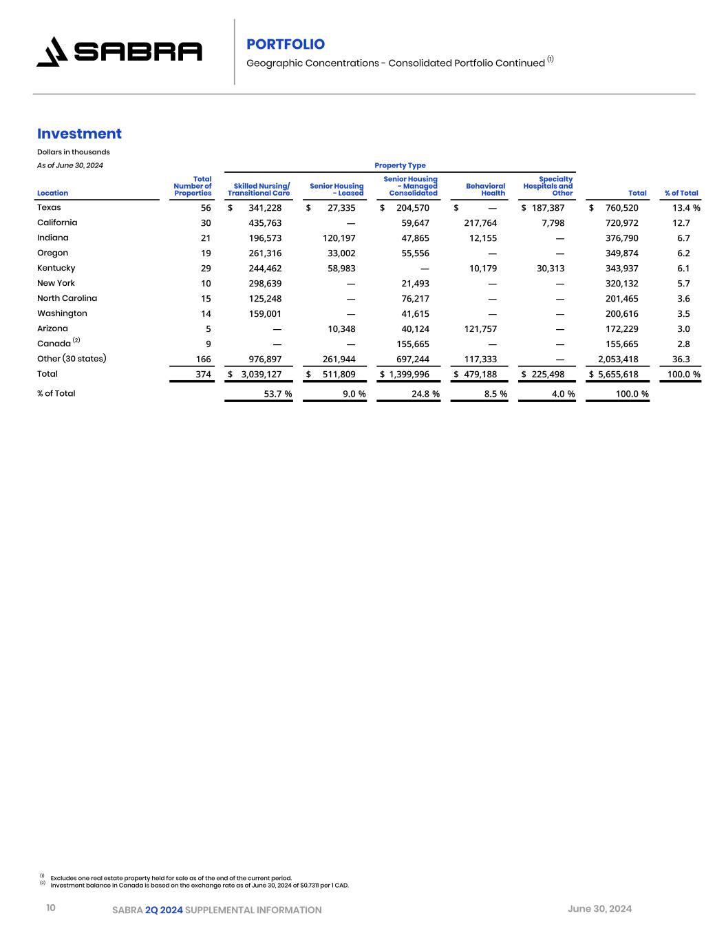10 SABRA 2Q 2024 SUPPLEMENTAL INFORMATION June 30, 2024 PORTFOLIO Geographic Concentrations - Consolidated Portfolio Continued (1) Investment Dollars in thousands As of June 30, 2024   Property Type Location Total Number of Properties Skilled Nursing/ Transitional Care Senior Housing - Leased Senior Housing - Managed Consolidated    Behavioral Health Specialty Hospitals and Other    Total % of Total Texas 56 $ 341,228 $ 27,335 $ 204,570 $ — $ 187,387 $ 760,520 13.4 % California 30 435,763 — 59,647 217,764 7,798 720,972 12.7 Indiana 21 196,573 120,197 47,865 12,155 — 376,790 6.7 Oregon 19 261,316 33,002 55,556 — — 349,874 6.2 Kentucky 29 244,462 58,983 — 10,179 30,313 343,937 6.1 New York 10 298,639 — 21,493 — — 320,132 5.7 North Carolina 15 125,248 — 76,217 — — 201,465 3.6 Washington 14 159,001 — 41,615 — — 200,616 3.5 Arizona 5 — 10,348 40,124 121,757 — 172,229 3.0 Canada (2) 9 — — 155,665 — — 155,665 2.8 Other (30 states) 166 976,897 261,944 697,244 117,333 — 2,053,418 36.3 Total 374 $ 3,039,127 $ 511,809 $ 1,399,996 $ 479,188 $ 225,498 $ 5,655,618 100.0 % % of Total 53.7 % 9.0 % 24.8 % 8.5 % 4.0 % 100.0 % (1) Excludes one real estate property held for sale as of the end of the current period. (2) Investment balance in Canada is based on the exchange rate as of June 30, 2024 of $0.7311 per 1 CAD.