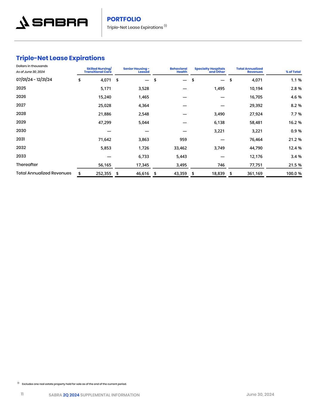 11 SABRA 2Q 2024 SUPPLEMENTAL INFORMATION June 30, 2024 PORTFOLIO Triple-Net Lease Expirations (1) Triple-Net Lease Expirations Dollars in thousands Skilled Nursing/ Transitional Care Senior Housing - Leased Behavioral Health Specialty Hospitals and Other Total Annualized RevenuesAs of June 30, 2024   % of Total 07/01/24 - 12/31/24 $ 4,071 $ — $ — $ — $ 4,071 1.1 % 2025 5,171 3,528 — 1,495 10,194 2.8 % 2026 15,240 1,465 — — 16,705 4.6 % 2027 25,028 4,364 — — 29,392 8.2 % 2028 21,886 2,548 — 3,490 27,924 7.7 % 2029 47,299 5,044 — 6,138 58,481 16.2 % 2030 — — — 3,221 3,221 0.9 % 2031 71,642 3,863 959 — 76,464 21.2 % 2032 5,853 1,726 33,462 3,749 44,790 12.4 % 2033 — 6,733 5,443 — 12,176 3.4 % Thereafter 56,165 17,345 3,495 746 77,751 21.5 % Total Annualized Revenues $ 252,355 $ 46,616 $ 43,359 $ 18,839 $ 361,169 100.0 % (1) Excludes one real estate property held for sale as of the end of the current period.