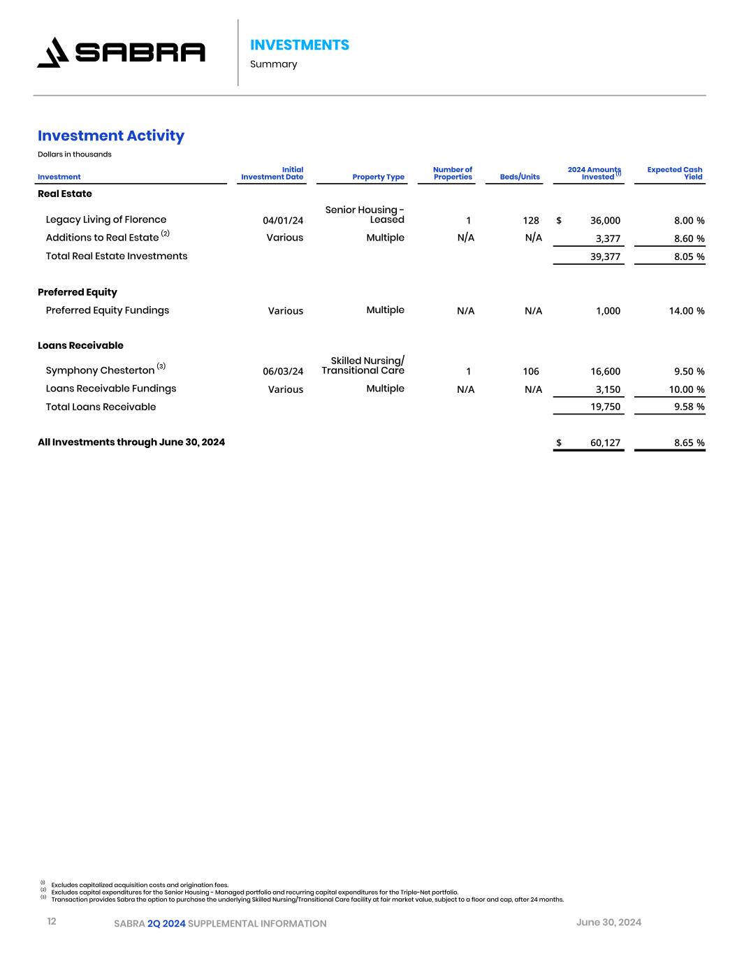 12 SABRA 2Q 2024 SUPPLEMENTAL INFORMATION June 30, 2024 INVESTMENTS Summary Investment Activity Dollars in thousands Investment Initial Investment Date Property Type Number of Properties Beds/Units 2024 Amounts Invested (1) Expected Cash Yield Real Estate Legacy Living of Florence 04/01/24 Senior Housing - Leased 1 128 $ 36,000 8.00 % Additions to Real Estate (2) Various Multiple N/A N/A 3,377 8.60 % Total Real Estate Investments 39,377 8.05 % Preferred Equity Preferred Equity Fundings Various Multiple N/A N/A 1,000 14.00 % Loans Receivable Symphony Chesterton (3) 06/03/24 Skilled Nursing/ Transitional Care 1 106 16,600 9.50 % Loans Receivable Fundings Various Multiple N/A N/A 3,150 10.00 % Total Loans Receivable 19,750 9.58 % All Investments through June 30, 2024 $ 60,127 8.65 % (1) Excludes capitalized acquisition costs and origination fees. (2) Excludes capital expenditures for the Senior Housing - Managed portfolio and recurring capital expenditures for the Triple-Net portfolio. (3) Transaction provides Sabra the option to purchase the underlying Skilled Nursing/Transitional Care facility at fair market value, subject to a floor and cap, after 24 months.