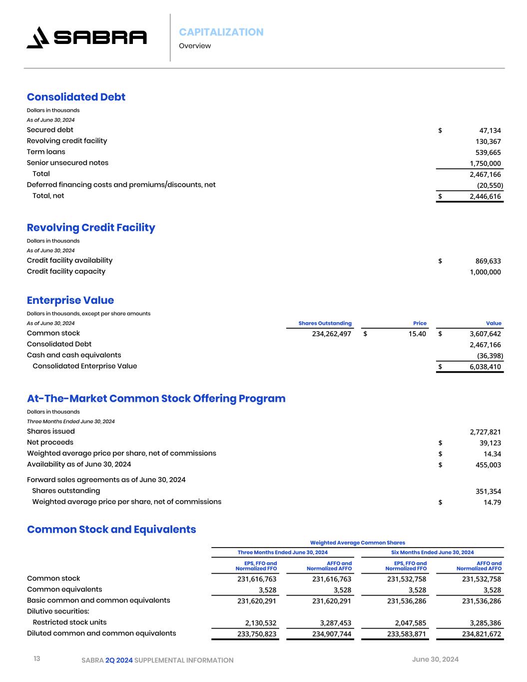 13 SABRA 2Q 2024 SUPPLEMENTAL INFORMATION June 30, 2024 CAPITALIZATION Overview Consolidated Debt Dollars in thousands As of June 30, 2024 Secured debt $ 47,134 Revolving credit facility 130,367 Term loans 539,665 Senior unsecured notes 1,750,000 Total 2,467,166 Deferred financing costs and premiums/discounts, net (20,550) Total, net $ 2,446,616 Revolving Credit Facility Dollars in thousands As of June 30, 2024 Credit facility availability $ 869,633 Credit facility capacity 1,000,000 Enterprise Value Dollars in thousands, except per share amounts As of June 30, 2024 Shares Outstanding   Price   Value Common stock 234,262,497 $ 15.40 $ 3,607,642 Consolidated Debt 2,467,166 Cash and cash equivalents (36,398) Consolidated Enterprise Value $ 6,038,410 Common Stock and Equivalents Weighted Average Common Shares Three Months Ended June 30, 2024 Six Months Ended June 30, 2024 EPS, FFO and Normalized FFO AFFO and Normalized AFFO EPS, FFO and Normalized FFO AFFO and Normalized AFFO Common stock 231,616,763 231,616,763 231,532,758 231,532,758 Common equivalents 3,528 3,528 3,528 3,528 Basic common and common equivalents 231,620,291 231,620,291 231,536,286 231,536,286 Dilutive securities: Restricted stock units 2,130,532 3,287,453 2,047,585 3,285,386 Diluted common and common equivalents 233,750,823 234,907,744 233,583,871 234,821,672 At-The-Market Common Stock Offering Program Dollars in thousands Three Months Ended June 30, 2024 Shares issued 2,727,821 Net proceeds $ 39,123 Weighted average price per share, net of commissions $ 14.34 Availability as of June 30, 2024 $ 455,003 Forward sales agreements as of June 30, 2024 Shares outstanding 351,354 Weighted average price per share, net of commissions $ 14.79