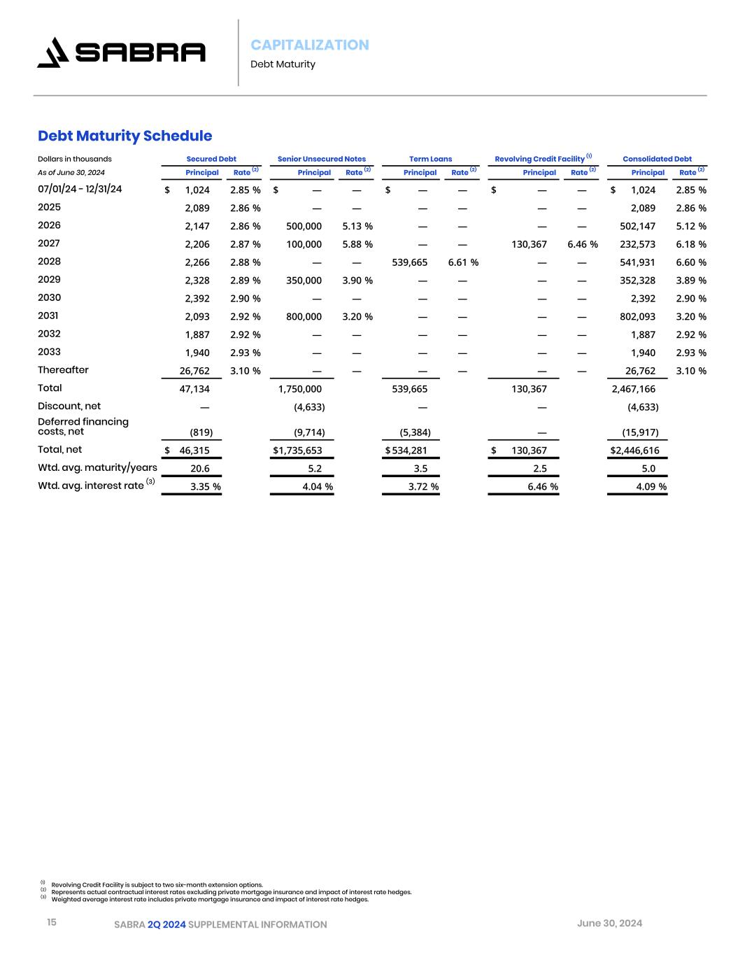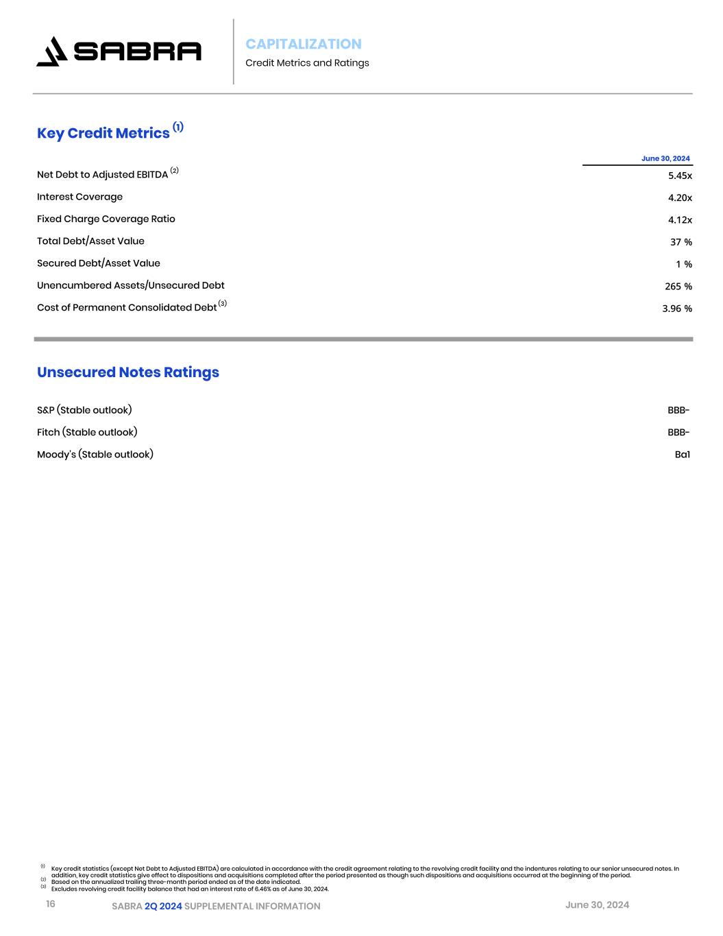 15 SABRA 2Q 2024 SUPPLEMENTAL INFORMATION June 30, 2024 CAPITALIZATION Debt Maturity Debt Maturity Schedule Dollars in thousands Secured Debt Senior Unsecured Notes   Term Loans     Revolving Credit Facility (1) Consolidated Debt As of June 30, 2024 Principal Rate (2) Principal Rate (2)   Principal Rate (2)     Principal Rate (2) Principal Rate (2) 07/01/24 - 12/31/24 $ 1,024   2.85 %   $ —   —     $ —   —     $ — — $ 1,024   2.85 % 2025 2,089   2.86 %   —   —     —   —     — — 2,089   2.86 % 2026 2,147   2.86 %   500,000   5.13 %     —   —     — — 502,147   5.12 % 2027 2,206   2.87 %   100,000   5.88 % —   —     130,367 6.46 % 232,573   6.18 % 2028 2,266   2.88 %   —   — 539,665   6.61 %     — — 541,931   6.60 % 2029 2,328   2.89 %   350,000   3.90 %     —   —     — — 352,328   3.89 % 2030 2,392   2.90 %   — — —   —     — — 2,392   2.90 % 2031 2,093   2.92 %   800,000   3.20 %     —   —     — — 802,093   3.20 % 2032 1,887   2.92 %   —   —     —   —     — — 1,887   2.92 % 2033 1,940   2.93 % — — — — — — 1,940 2.93 % Thereafter 26,762   3.10 %   —   —     —   —     — — 26,762   3.10 % Total 47,134   1,750,000 539,665     130,367 2,467,166 Discount, net — (4,633) — — (4,633) Deferred financing costs, net (819) (9,714) (5,384) — (15,917) Total, net $ 46,315 $ 1,735,653 $ 534,281     $ 130,367 $ 2,446,616 Wtd. avg. maturity/years 20.6   5.2 3.5     2.5 5.0 Wtd. avg. interest rate (3) 3.35 %   4.04 % 3.72 %     6.46 % 4.09 % (1) Revolving Credit Facility is subject to two six-month extension options. (2) Represents actual contractual interest rates excluding private mortgage insurance and impact of interest rate hedges. (3) Weighted average interest rate includes private mortgage insurance and impact of interest rate hedges.